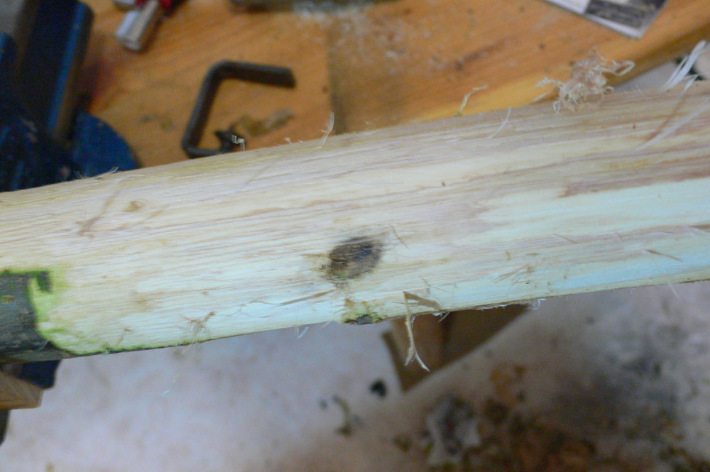 Ich vermute, der läuft von der Bauchseite mittig des Staves, zur Rückenseite Richtung Außenkante oder? Dann besteht eine gute Chance, das der Ast aus dem Bogen raus fällt wenn du den Bogen in seine Form bringst. Er ist ja so schon sehr am Rand gelegen. Ich würde daher versuchen den Bogen so in den Stave zu legen das genau dies möglichst so hinkommt. Der Ast ist nämlich wirklich ein bisschen blöde.