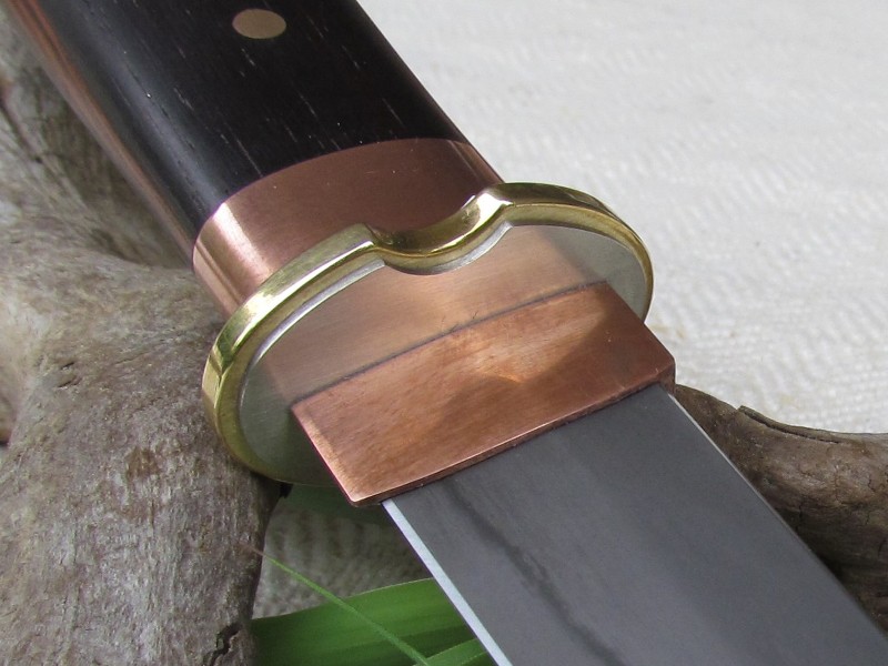 normalerweise plane, designe ich vorgängig meine Messer und suche/wähle anschließend das geeignet Material. Bei diesem Teil habe ich in meinen Materialkisten herumgewühlt und eine alte Feile, Messing, Neusilber, etwas Horn, der letzte Rest Ebenholz und Kupferblech auf dem Tisch gestapelt. Da mich die Konstruktion japanischer Messer interessiert ist nach etwas "googeln" und skizzieren folgendes Teil entstanden - das Messer ist ca. 25,5 cm lang, die Klinge ist 14,5 cm und differentiell mit Härtelinie gehärtet.