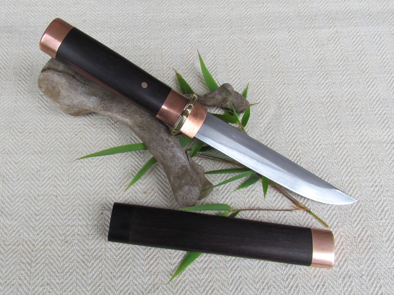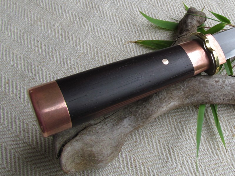 normalerweise plane, designe ich vorgängig meine Messer und suche/wähle anschließend das geeignet Material. Bei diesem Teil habe ich in meinen Materialkisten herumgewühlt und eine alte Feile, Messing, Neusilber, etwas Horn, der letzte Rest Ebenholz und Kupferblech auf dem Tisch gestapelt. Da mich die Konstruktion japanischer Messer interessiert ist nach etwas "googeln" und skizzieren folgendes Teil entstanden - das Messer ist ca. 25,5 cm lang, die Klinge ist 14,5 cm und differentiell mit Härtelinie gehärtet.