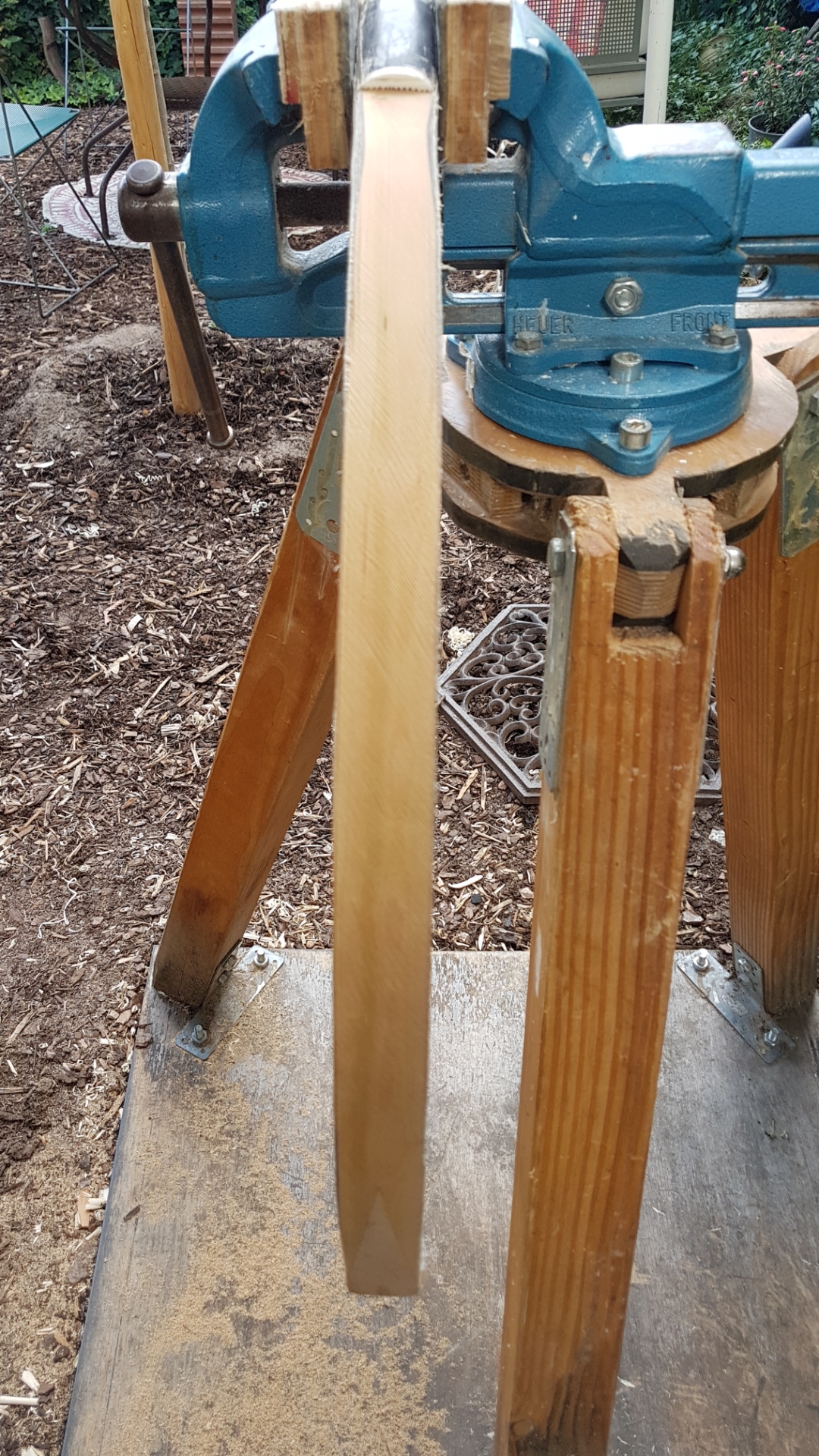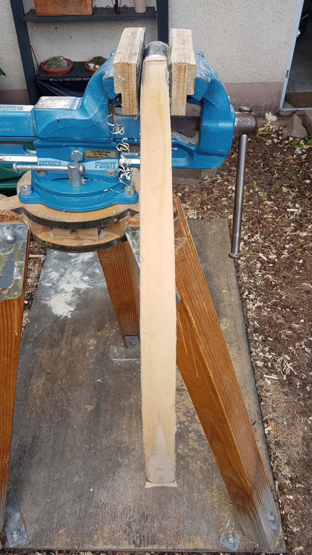 Die Hornstreifen sind geklebt (UHU Plus Endfest 300). Zunächst habe ich die seitlichen Überstände entfernt, dann die WA und den Griff abgerundet. Dann angefangen zu tapern. Ich werde in etwa 2 mm Dickentaper vornehmen (ab Fadeout bis Ende). Mal sehen ob das passt.