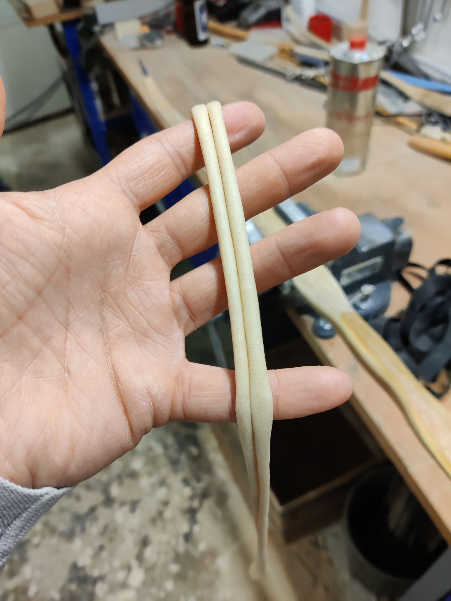 In der Zwischenzeit hab ich natürlich einige male geschossen. Nach den ersten mal Schießen hatte er 40#@27" und als ich im November bei Basti war haben wir ihn nochmal gemessen. Da hatte er dann 50#@28". Seitdem war er nicht mehr aufgespannt. Und natürlich will ich ihn auch nicht nochmal aufspannen bevor er sein Rohhautbacking drauf hat. Er sieht jetzt im Profil so aus: Heute hab ich mal Streifen aus einer Ziegenrohhaut zugeschnitten und aktuell hab ich ein wenig Zweifel an der Reißfestigkeit... Da ich aber gleich 5 ganze Häute bestellt hab und somit auch nicht grade billig war, werd ich sie auf jeden Fall versuchen. Ich hab parallel noch einen Eiberecurve mit Sehnenbelag liegen der ebenfalls auf eine Rohhaut wartet also werd ich die Häute zuerst am Eiberecurve testen.