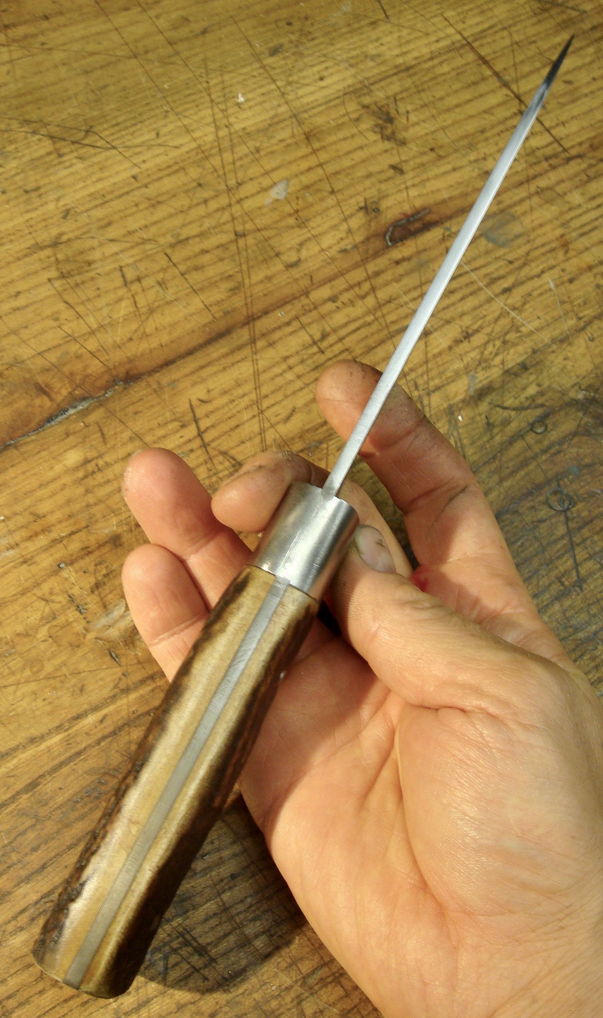 Das Messer hier hat eine Tülle und der Holzteil geht innen durch. Die Mehrheit meiner Messer ist so.