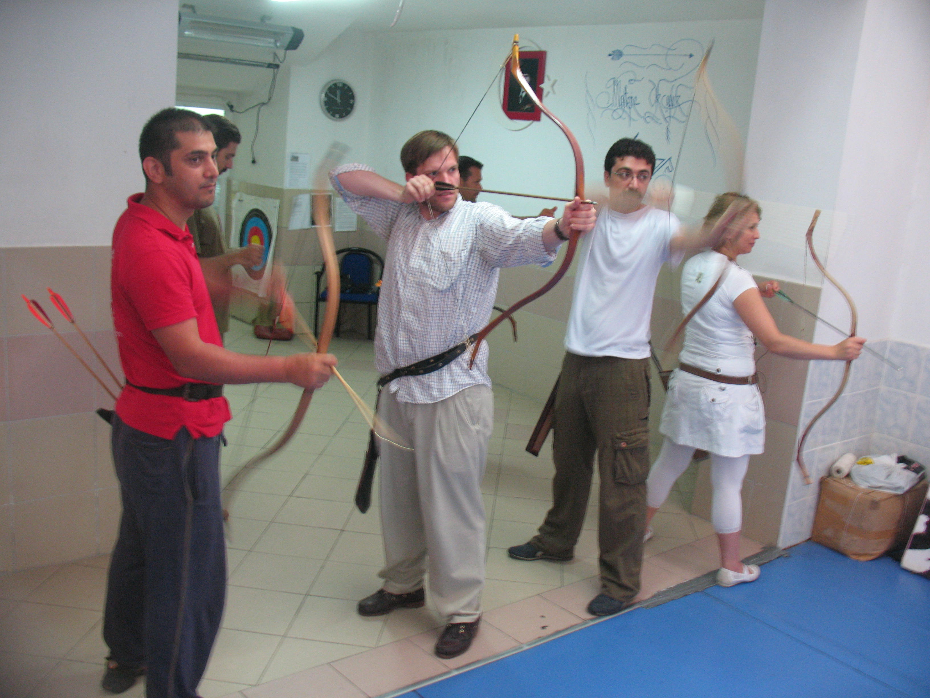 Die Gruppe hat einen Übungsraum im Keller des Stadions, wo ungefähr 20 Meter weit geschossen werden kann. Ich wurde mit viel Geduld (und Gelächter) in die Daumentechnik eingewiesen, die Sache machte auch sehr schnell für mich Sinn - man muss es nur mal richtig gezeigt kriegen!! Das einzig Dumme war, dass ich natürlich einen Daumenring leihen musste, der nicht richtig passte und meinen Daumen ziemlich malträtiert hat. Eigentlich hätte ich mal ein "vorher-nachher"-Foto vom Daumen machen müssen. Nach drei Stunden war er ziemlich bläulich... Dazu noch die neue Technik im Kopf behalten, sich unterhalten in Türkisch, Deutsch und Englisch fast gleichzeitig, Istanbuler Sommerhitze - ich war ziemlich fertig hinterher. Quasi Extrem-BOgenschießen... Hier ein Foto, der schwitzende blonde Ausländer mit dem Bogen "im Anschlag" ist meine Wenigkeit (der noch sehr viel üben muss...)
