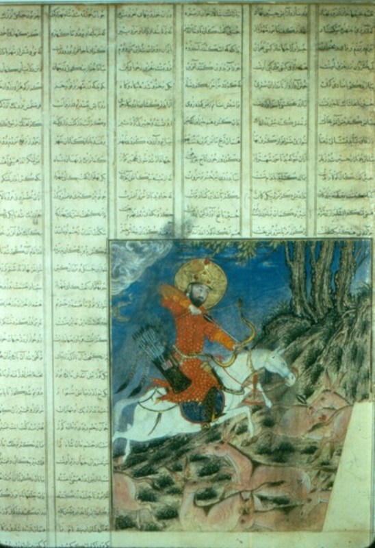 2. Jäger in einer persischen illustrierten Handschrift, wohl Bahram Gur, der mächtige Jäger aus Ferdowsis "Shahname" - eher kurzer Auszug, ähnlich der Münze