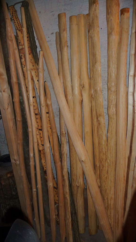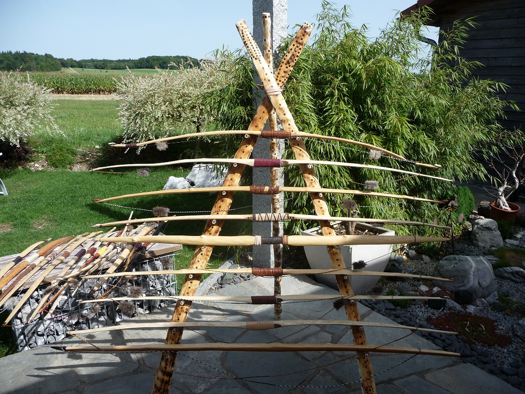 Die beiden dickeren Staves hab ich gespalten, die reflexen Hälften entrindet und die Stirnseiten versiegelt. Die deflexen Hälften mit Beilegeklötzen reflex vorgespannt zusammengebunden, Stirnseiten versiegelt und mit Rinde gelagert. Die Staves mit 9 und 6cm hab ich ganz gelassen, entrindet und versiegelt gelagert.