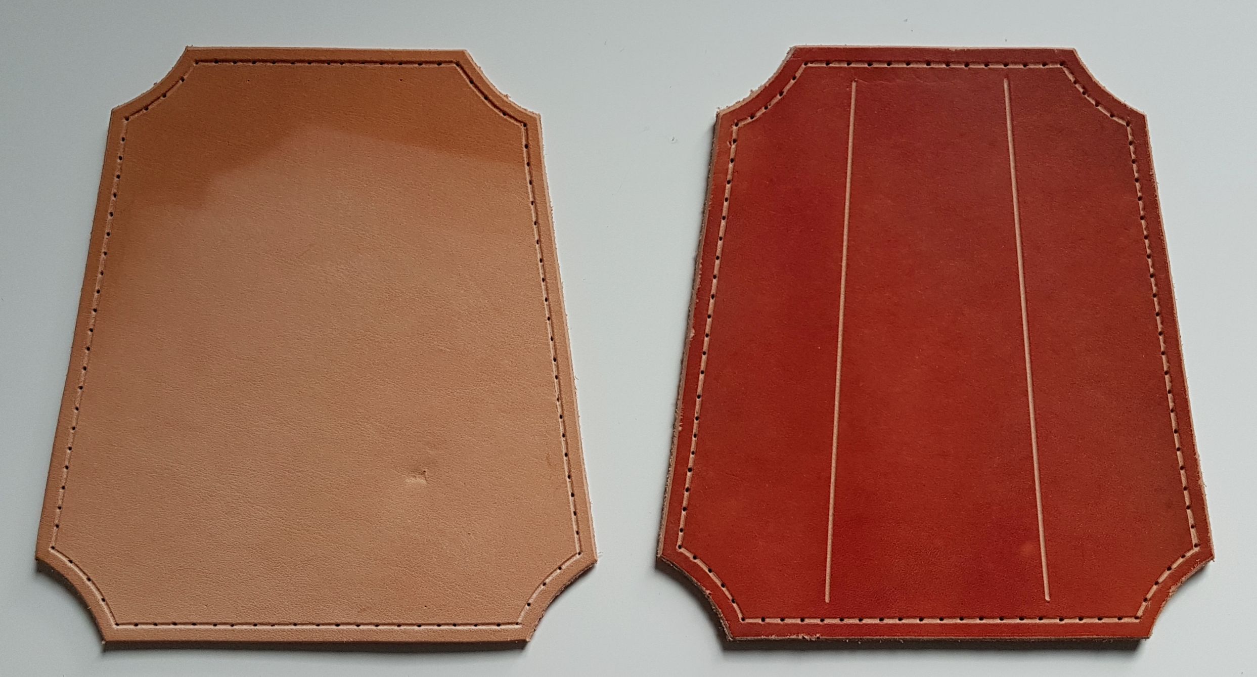 Das Leder ist im Bad gefärbt. Da es aber vegetabil gegerbtes Leder ist, ist das färben etwas aufwendig, denn das Leder muss zuerst gebeizt werden. Das zusammen dauert Tage, insofern ist es sinnvoller sämisch gegerbtes Leder zu benutzen. Die dunkelrote Farbe entsteht aber erst durch die Behandlung mit dem Wachs.