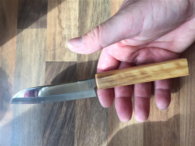 Bin eigentlich sehr zufrieden, hatte erst Sorge, das ich die Härte nicht erreicht habe beim Erhitzen mit dem Gasbrenner, aber scheint zu passen, lässt sich gut schärfen (zum Rasieren und Tomatenschneiden reicht es allemal
