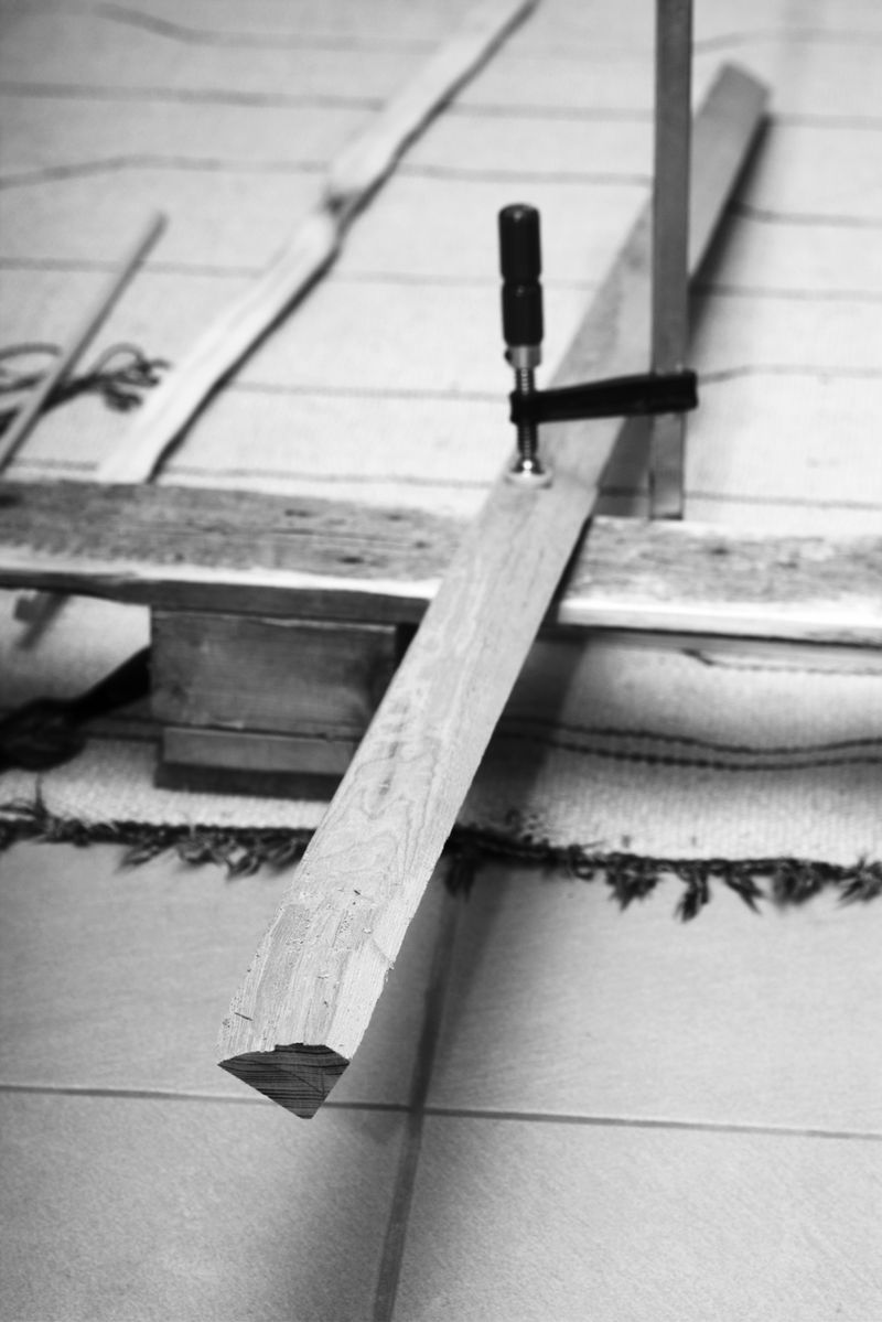 Das mit dem Tisch vergiss mal. Geht nur der Tisch futsch. Mein System im Anhang: Palett zersägen (Japansägen sind da traumhaft) (wenn man gerade sägt), Bogen darauf festklemmen, und los geht der Spass. Mit den Beinen fixiere ich das Palett, der Stave geht rechts von mir durch (weil ich Rechtshänder bin) bzw. wenn ich am Ende des Staves schaffe drück ick es in meinen Bauch mit einer dicken Schicht Leder dazwischen. Je nachdem kann man den Stave auch weiter hinten einspannen, aber das eignet sich eher später mit feineren Werkzeugen, wenn man nicht mehr so Druck geben muss. Arbeiten kann man von beiden Seiten her, man kann auch mit dem Schweifhobel zu den Tips hin stossen (für die, die Schweifhobel stossen) und dabei auf dem Palett sitzen. Funktioniert ganz gut, bei mir im Wohnzimmer, wie du siehst. Und lässt sich gut versorgen, braucht nicht viel Platz
