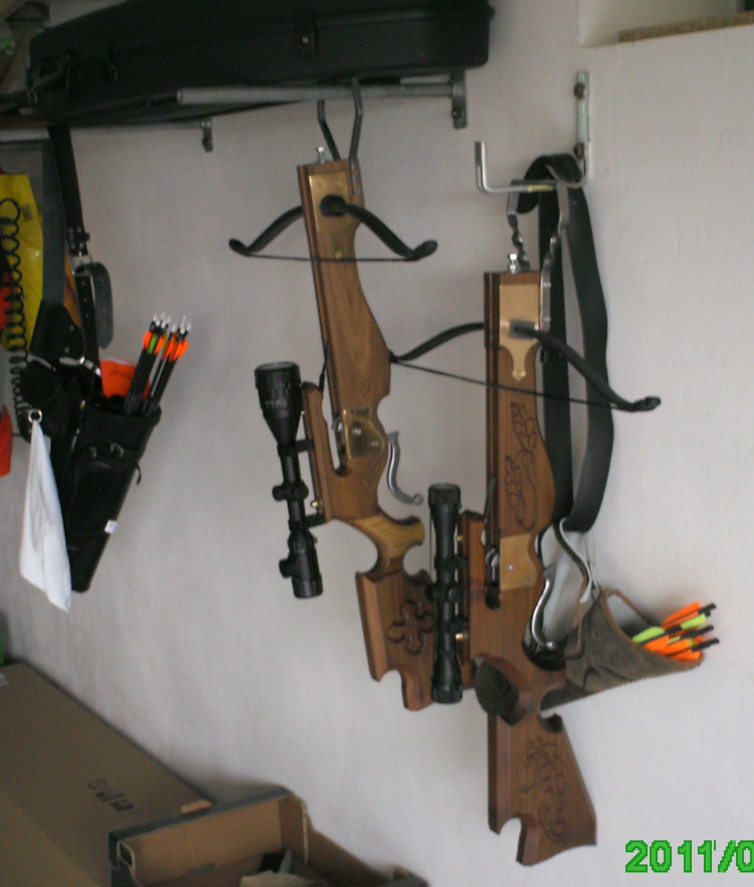 Mit einem schweren Buschmesser, einer Astsäge, einer Handbohrmaschine, Stechbeiteln und ein paar Kleinigkeiten habe ich dann eine Armbrust und einige Bögen gebaut.