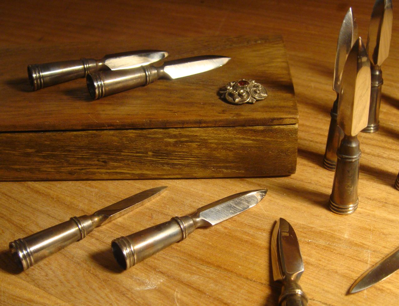 aus Dentalstahl, härtbar, passen etwa auf 11/32 Schäfte und wiegen so um die 140gr (denke ich... muss aber alle noch mal genau wiegen)