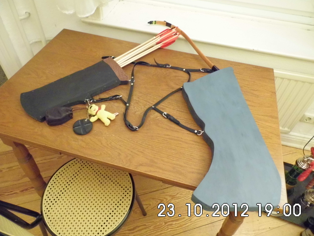 Aber jetzt geht's ja zum Glück weiter! Sateless, ich bin gespannt auf die Tragevorrichtung. Die hab ich bei meinen beiden Köchern nicht richtig hingekriegt, hängt alles irgendwie schief und nicht gut ausbalanciert.