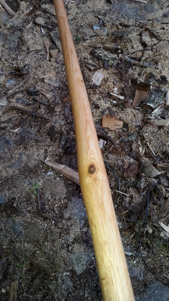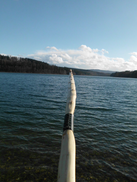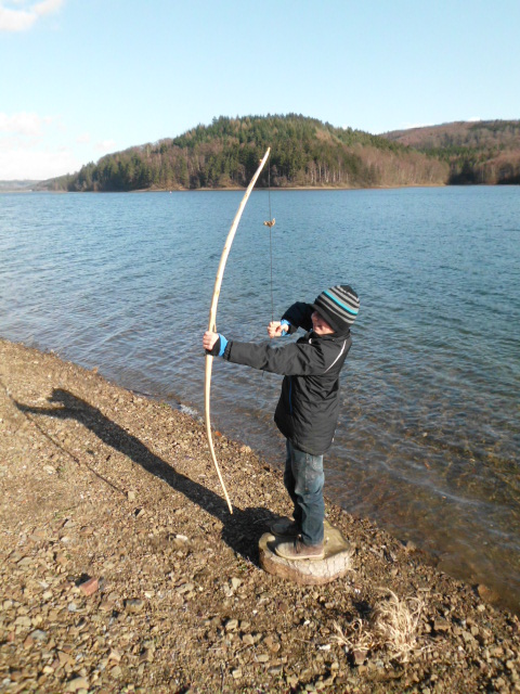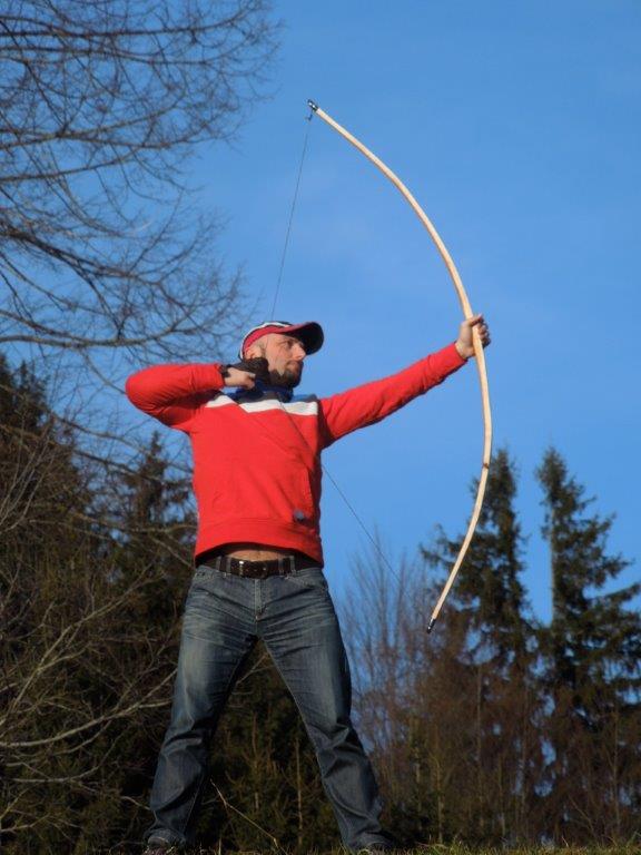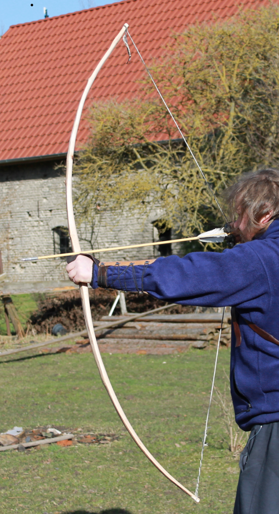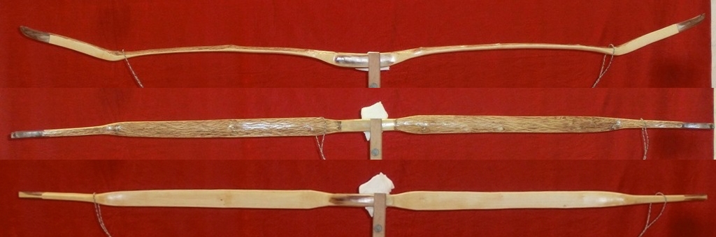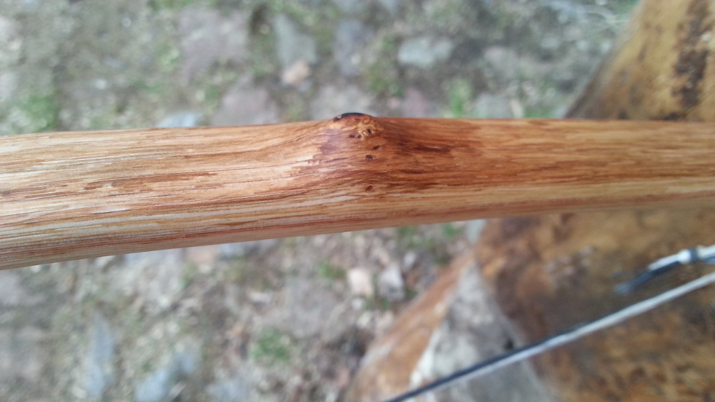 Eingehängt wird sie in verschliffene Nocks mit stehenden Ringen aus Apfelholz (die Verfärbungen an der Spitze sind im Holz).