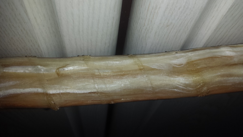 Wie man gut erkennen kann ist in der Wurfarmmitte die Sehne noch nicht ganz getrocknet (miliche Schicht) und gibt auf Druck mit dem Finger noch immer etwas nach.