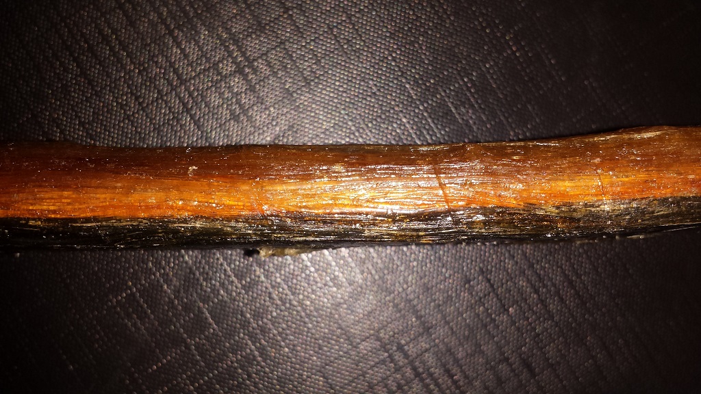 zuerst habe ich des Horn nochmal komplett flach geschliffen um keine Huggel/Dellen mehr drin zu haben. Dazu hab ich wieder mein Schleifbrett benutzt. Danach hab ich den Rahmen runtergearbeitet mit Schnitzmesser, Schweifhobel und Ziehklinge. Effektiv getillert hab ich über den Rahmen der gaaanz leicht dünner wird. Die Wurfarme an sich werden ebenfalls vom Griff aus gesehen schmaler aber nicht viel.