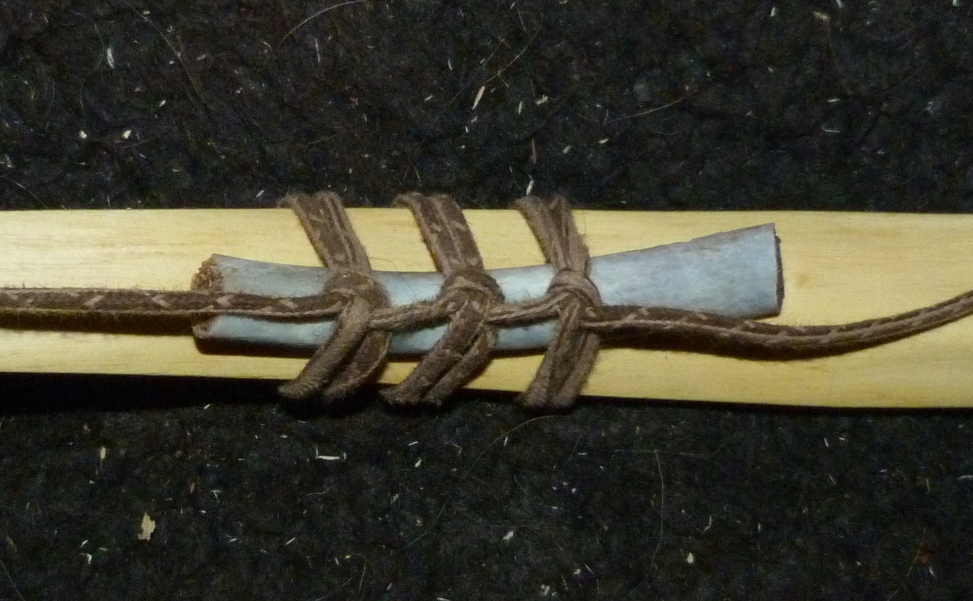 der Bogen hat nun eine Schicht Öl mit Pigmenten erhalten und bekommt weitere Schichten Öl und Wachs und dann kann es ans Knoten des Kabels gehen...