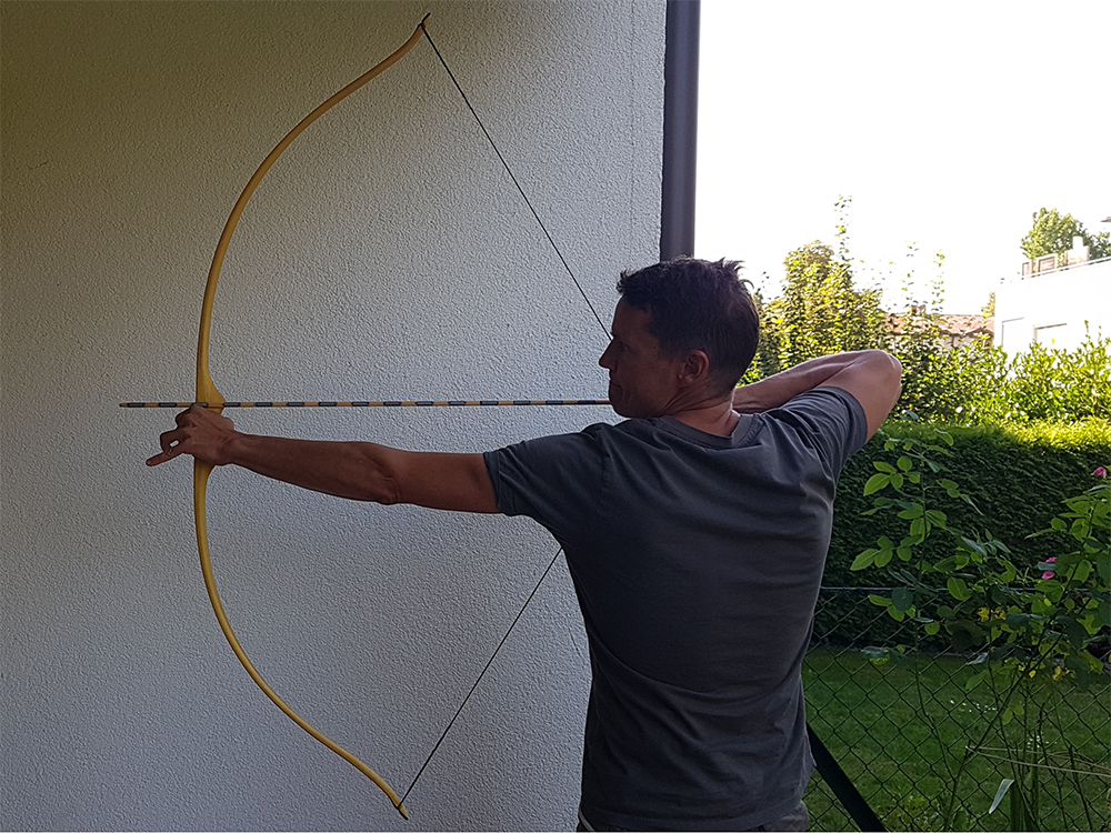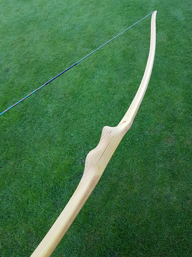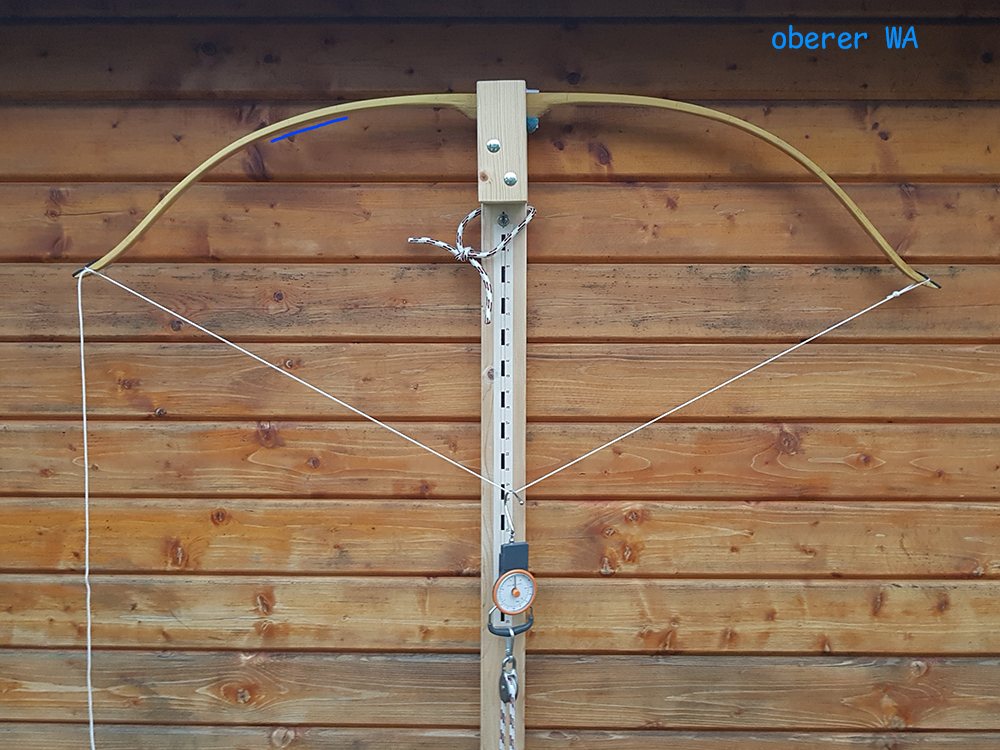 Aktuell hat der Bogen 38lbs bei 28'' Auszug. Masse=387g (ohne Sehne, ohne Griffleder), Länge=59''/150cm (Nocke bis Nocke). Ursprünglich hab ich 30-35lbs Zuggewicht geplant (wobei 38 sich auch gut anfühlt). Für das Feinschleifen oder ev. Korrekturen ist also noch etwas Reserve.
