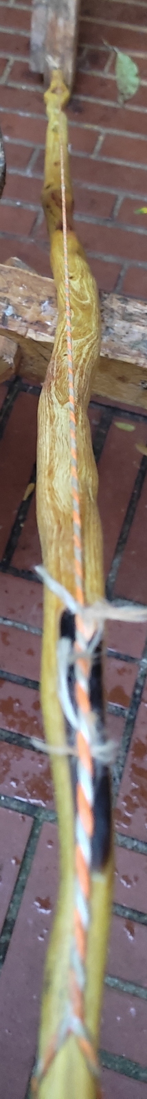 Erstmal einen seitlichen Knick im unteren Wurfarm korrigieren: Das ist schonmal deutlich besser. Der Tip könnte ggf. noch etwas mehr nach links, oder aber ich drehe den ganzen Bogen um, dann geht es für Rechtshänder. Das ist wegen der eher steiferen Stelle am Astloch sowieso eine Idee.