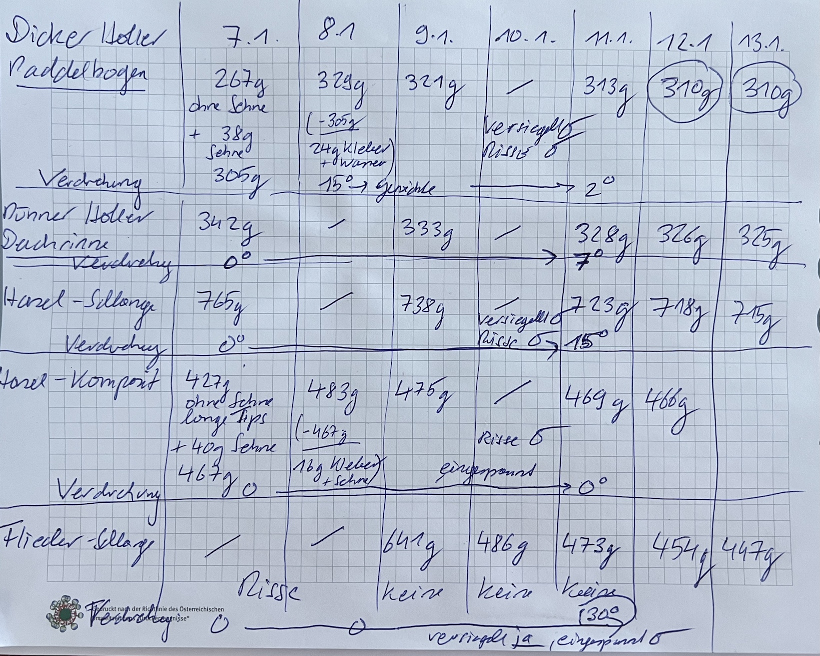 Wenn der Bogen also nur noch 313 g, kann das nur bedeuten, dass das Holz noch nicht trocken ist oder die Waage defekt ist.
