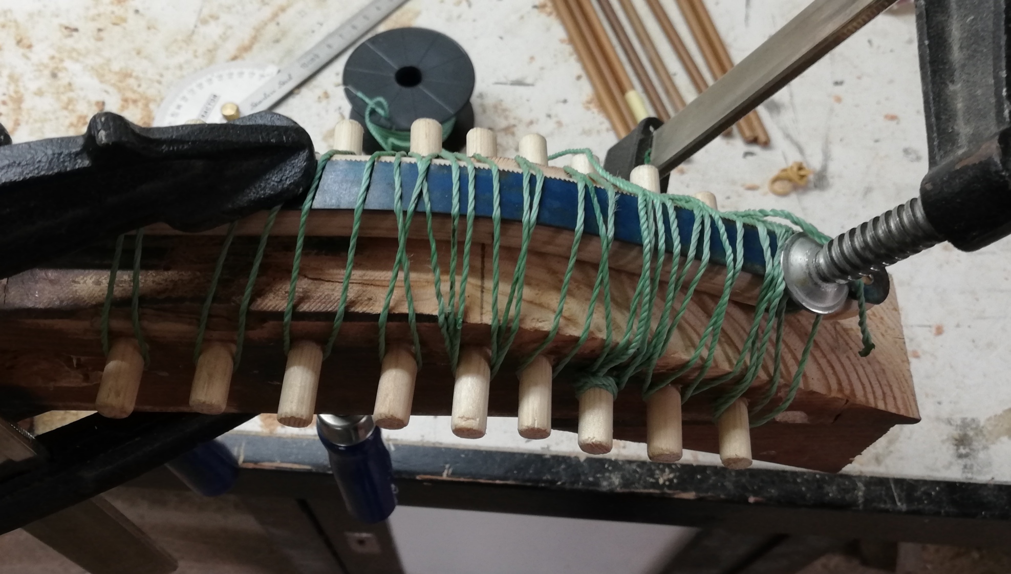 . Mit Folie abgedeckt und 45 Minuten lang ziehen lassen. Das Ende hab ich vorher noch mal geschliffen damit der Dampf auch ordentlich einziehen kann. Dann flott auf die Form und der WA hat sich butterweich biegen lassen. Zur Sicherheit ein altes Sägeblatt dann geklemmt damit sich kein Span abhebt, denke es wäre auch ohne gegangen, geknakst hat nichts.