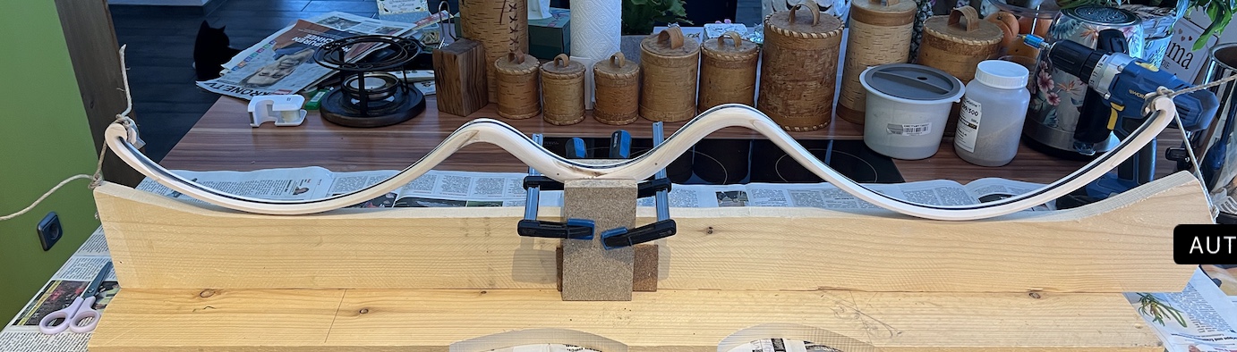 Über Nacht habe ich den Bogen eingespannt um etwas Reflex rauszunehmen. Heute dann die Sehnen Session. 3 Sehnen sind mir gelungen aufzutrennen ohne die die Kontinuität zu zerstören. Einweichen der Sehnen in lauwarmes Wasser unter Zusatz von 2 Tropfen Spülmittel. Über Nacht habe ich schon Hautleim quellen lassen und dann im Leimkocher auf 55 Grad erwärmt. Im Leimtopf sind 2 Kammern, eine für dünnflüssigen Leim, eine für zähflüssigen. Der Bogen bleibt während dem Sehnenbelegen eingespannt. Zuerst Reinigung mit Aceton. Dann mit heißem Wasser bestreichen und trocknen lassen, damit sich die Fasern aufstellen. Fühlt sich nach dem Trocknen deutlich rauer an. Dann 3x Einstreichen mit dünnflüssigem Leim und zwischen jedem Anstrich mit dem Haarföhn erwärmen damit er besser einzieht. Die eingeweichten Sehnen mit Wasser sauber Spülen, dann wird die erste Sehne in den zähflüssigen Hautleim gelegt. Mit der Spitze eines Essstäbchens werden dabei die Fasern auseinander gedrängt, damit der Leim in alle Ecken kommt. Nach fünf Minuten wird die Sehne herausgenommen, überschüssiger Leim vorsichtig ausgestrichen. Die Sehne wird auf einem glatten Brett flach gestrichen, dann mit einem Messer abgehoben und die Sehnenplatte jetzt dem Wurfarm aufgelegt, mit dem Finger flach streichen und Lufteinschlüsse rausmassieren. Die beiden weiteren Sehnen werden in gleicher Weise aufgebracht, die 10 Zentimeter langen Überlappungen befinden sich genau im Spleißbereich der beiden Bogenknie. Die Ränder sehen wulstig aus. Wie immer siehts nicht perfekt aus. Wickeln mit breitem Hosengummei hin und zurück (gegengleich damit sich nichts verdreht). Im eingespannten Zustand gehts jetzt ab in die Sauna, 55 Grad 1 Stunde. Dann 1 Stunde abkühlen lassen und Auswickeln. Jetzt siehts deutlich besser aus, die Randbereiche der Sehne sind glatt auslaufend, in der Mitte ist der Sehnenbelag am dicksten. Sieht jetzt eigentlich richtig gut aus. Jetzt über Nacht trocknen lassen, dann wird der Bogen wieder eingespannt. Der Bogen wiegt jetzt 442 Gramm. LG Stephan