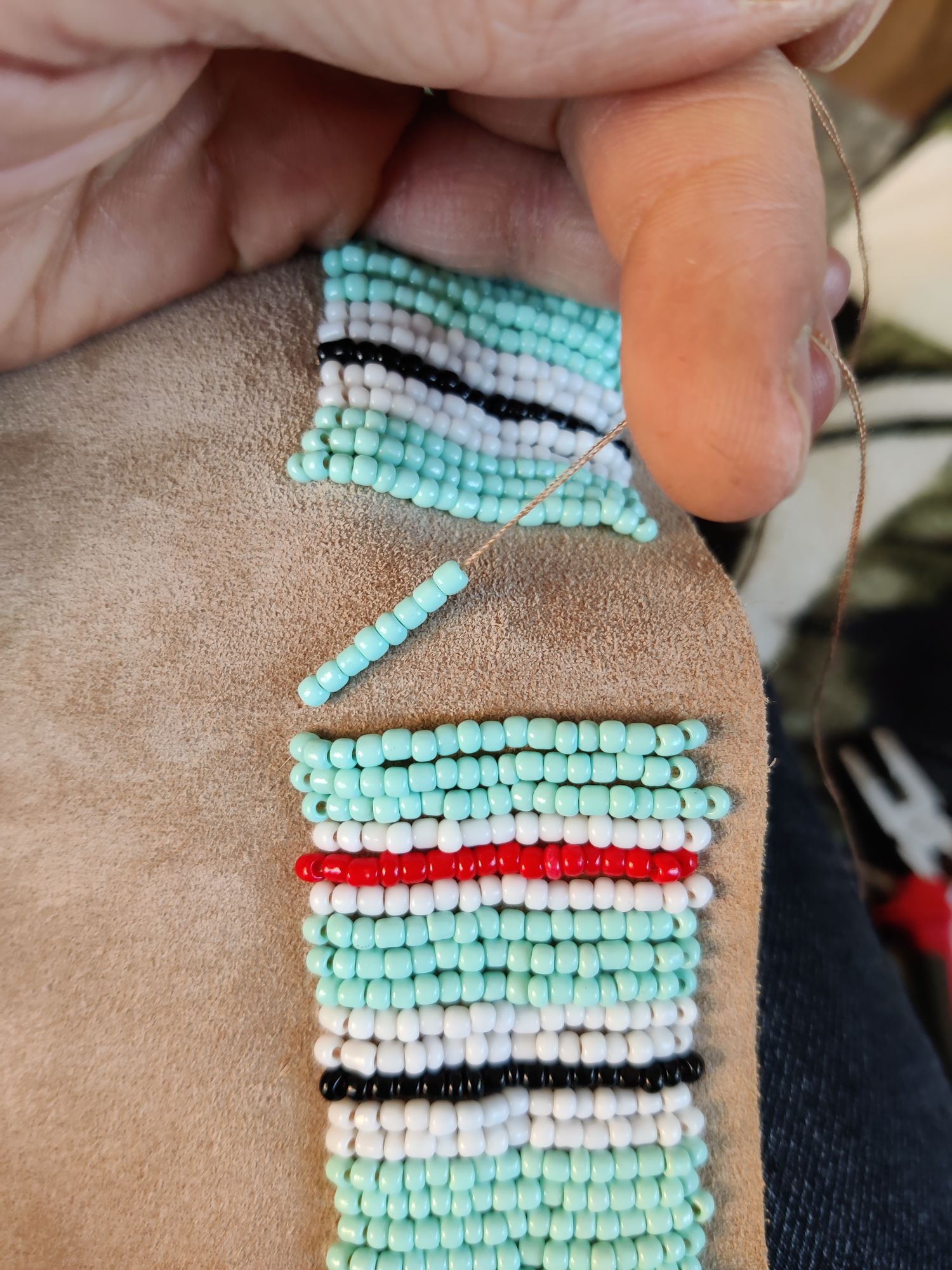 Der Köcher färbt jetzt nicht mehr ab und ich hab begonnen die Riemchen am Köcher zu befestigen. Zuerst mit Kleber auf Position fixiert, dann hab ich die weiße Perlenreihe befestigt, aber gleich alle am Stück ohne zwischenstiche. Wäre mir zu schwierig da beim durchstechen die richtige Position zu treffen. Deshalb hab ich dann für besseren halt unter der blauen Perlenreihe hin und her gestochen. Somit sieht man die Naht nicht.