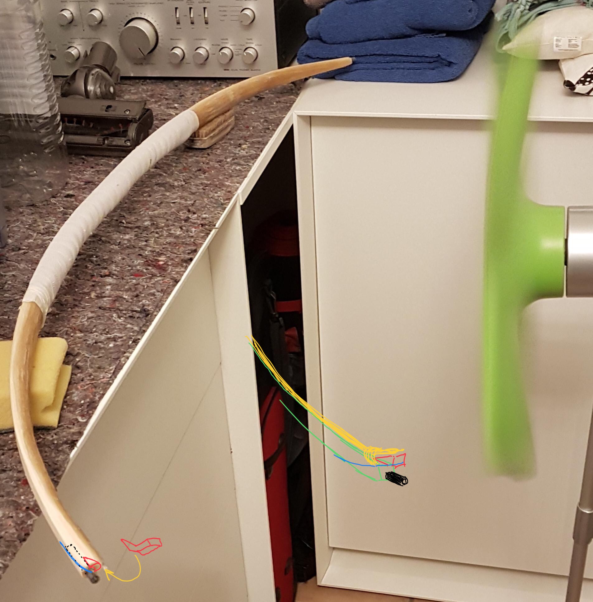 Bogen 02 lang: im Griffbereich war rückenseitig eine Vertiefung, die gestört hat. Der Griff soll nämlich unbedingt steif bleiben und noch deutlich schmaler werden als er jetzt ist. Deswegen habe ich die Stelle ausgeraspelt und aus dem Reststück Pfaffe ein Stück eingepasst. Außerdem hat die Bauchseite auch noch eine Aufdopplung erhalten.