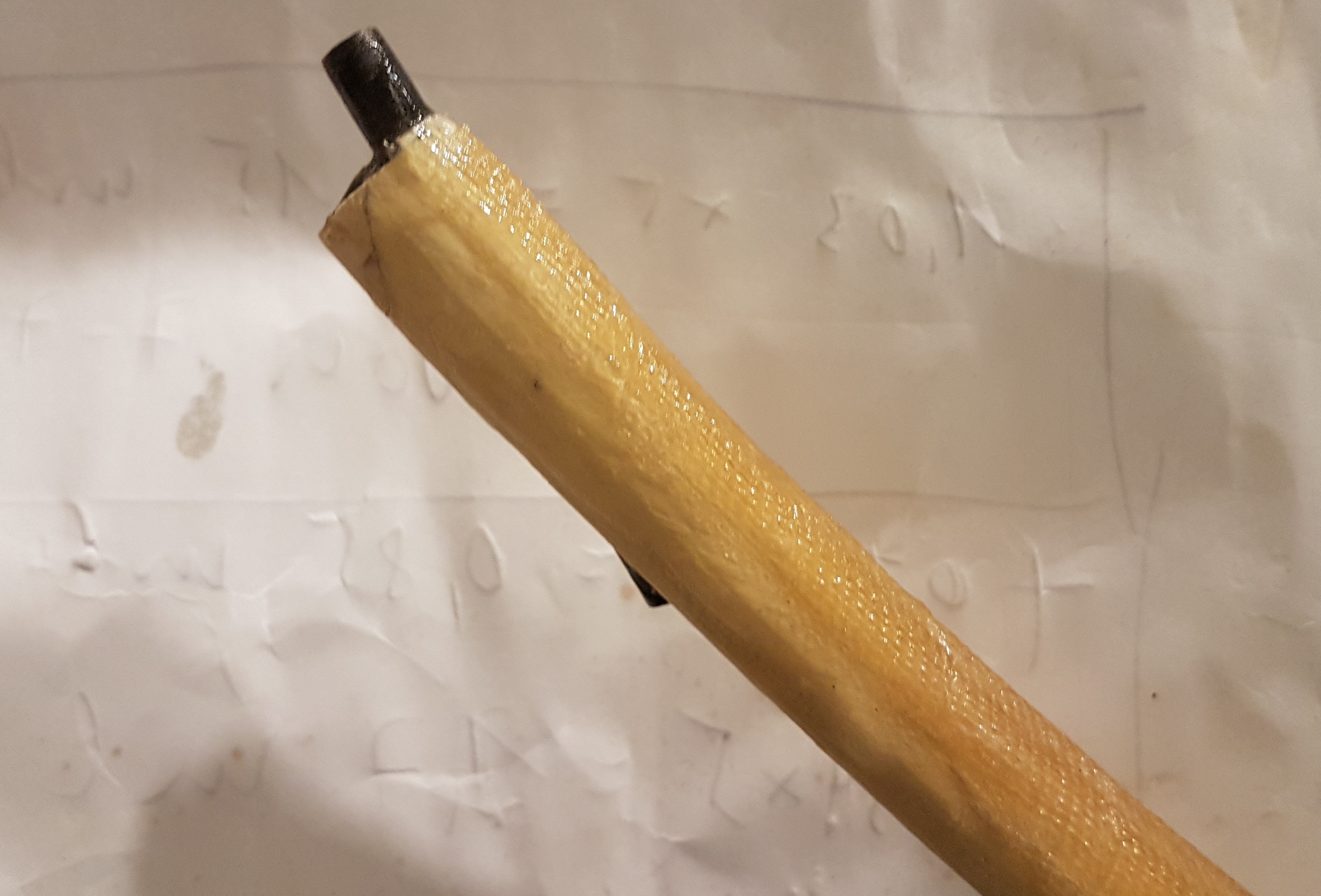 Vorhin habe ich neue Horndübel geschnitten und geschliffen. Erst Stifte mit der Bandsäge geschnitten, dann per Hand annähernd rund geschliffen und final in den Akkuschrauber gespannt und rund auf Passung geschliffen.