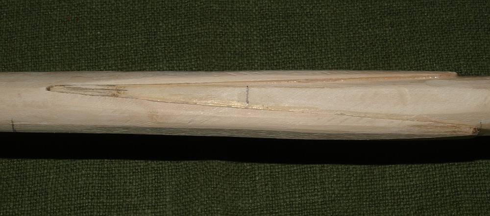Nachdem der erste Hollerbogen schießt, aber mit 26 lb zu schwach ist, habe ich die beiden restlichen Stäbe für einen zweiten Vollstab-Bogen verwendet. Die dicken Enden im Griff gespleißt, Spleißlänge rund 18 cm. Meine Bauzeiten sind deswegen so kurz, weil ich den ganzen, vollen Stab verwende ohne viel runterzuarbeiten. Zudem verwende ich eine konkave Hobelklinge zum Abschaben von Rinde und Holz: Das geht verdammt schnell, viel schneller als jeder Handhobel.