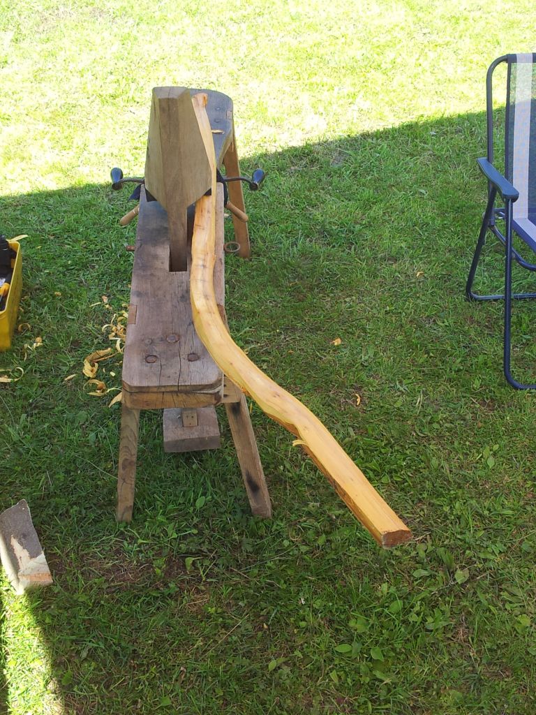 Bisher habe ich ihn fertig getrocknet, die Rinde abgenommen, angezeichnet, leicht ausgebogen und grob zugeschnitten.