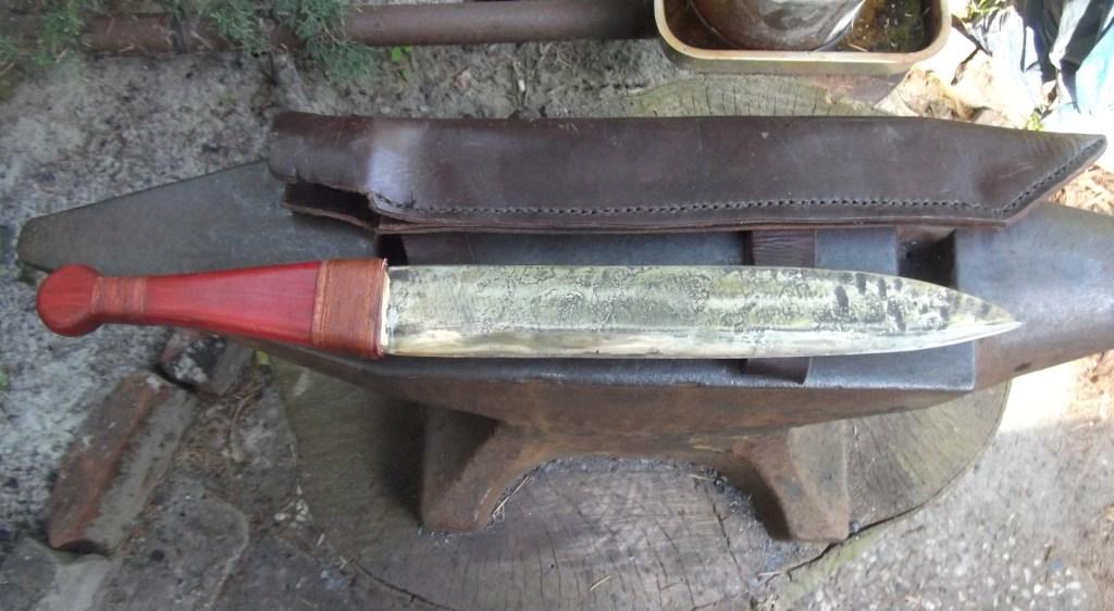 ausgeschmiedet, in Öl gehärtet und anschließend bei ca. 220°C 1 Std. Gold angelassen, Griff aus Wachholder, hellrot