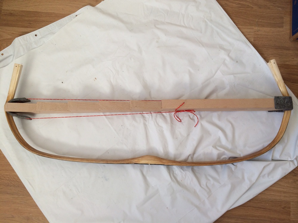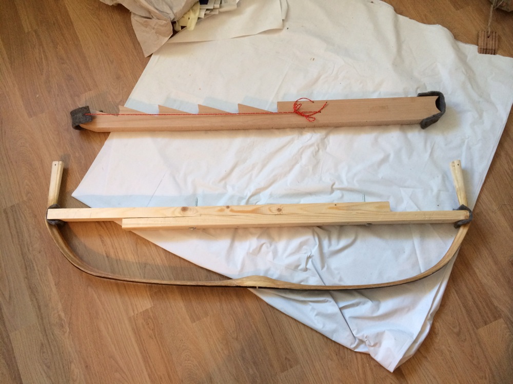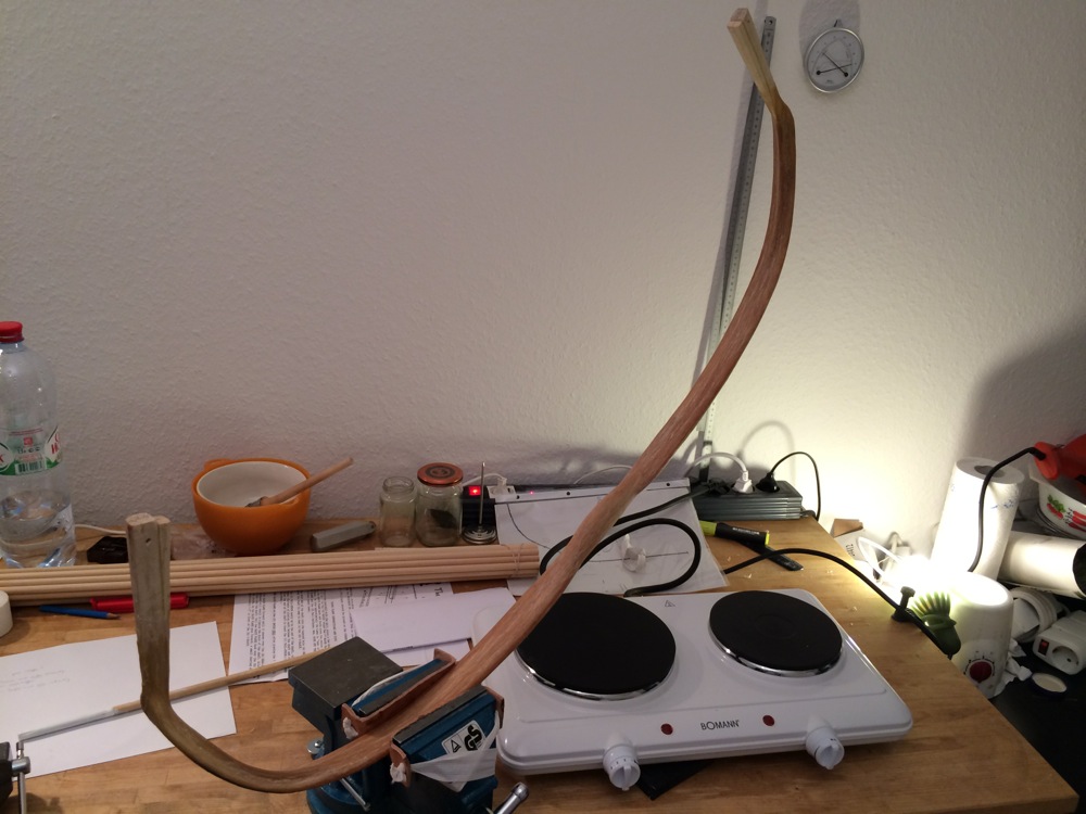 Aber so ganz happy bin ich noch nicht. Bei dem einen Wurfarm habe ich das Gefühl, dass die Oberfläche des Horns irgendwie schräg ist, also nicht genau senkrecht zur Biege-Ebene. Wenn das stimmt, dann hätte ich irgendetwas Gröberes falsch gemacht. Vlt zu unterschiedlich die Seiten der Wurfarme mit Sehnen belegt, so dass sich in die Wurfarme eine leichte Spirale reingezogen hat? Na ja. Ich will mir jetzt Zeit lassen und genau überlegen, was da los ist.