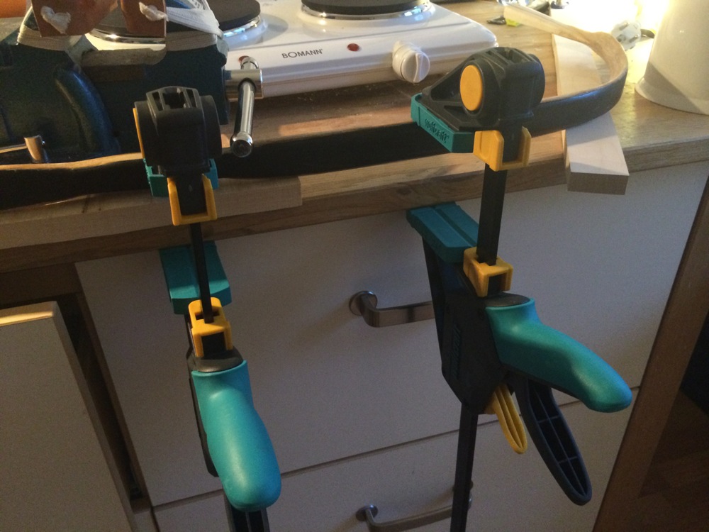 Heute habe ich schnell eine (wirklich gruselige und zu lange) Tillersehne gebastelt und den Bogen erst auf Tepliks gebogen und dann mit diesem Provisorium gespannt: