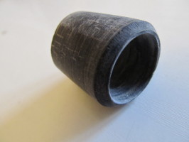 Darauf wurde in die Bohrmaschine ein zuckerhutförmiger Schleifstein aus dem Dremelprogramm eingespannt (man kann auch einen eckigen solchen vorher zurechtfeilen). Der vorgebohrte Zylinder wurde dann per Rohrzange ergriffen und so über den rotierenden Schleifstein geführt, dass dieser die Ausbohrung erweiterte (ganz zylindrisch wurde die Ausbohrung leider nicht). Dabei habe ich immer wieder Pause gemacht und gesehen, ob das Ganze nunmehr auf den Daumen passt. Als der Ring mit Gewalt drüberging habe ich aufgehört, den Zylinder abkühlen lassen und auf die u. g. Länge abgesägt.Orientierenung für die Länge war, dass eine ausreichend lange Versteifung des ersten Daumengelenkes möglich sein mußte (chin. Schießen mit gestrecktem Daumen).