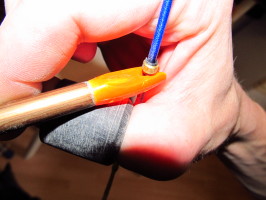 So im Auszug - und auf einem Bein stehend ... - philospohierte ich über das, wie Selby u. a. mal geschrieben haben, wie man lösen sollte - nicht Aufreißen lassen, sondern schön geregelt ruhig öffnen etc. . Und als ich mir dann dachte, dass ich´s vielleicht sooo ...... machen könnte, war es zu spät: Die Sehne kam sofort von der Kante des Ringes nach vorn, Auslösung erfolgt, der Pfeil flog durchs Schlafzimmer, passierte dank geöffneter Tür den Flur, kam im dahinterliegenden Bad an, prallte gegen...., welches er, trotz noch nicht mal angeschraubter Spitze (hatte ihn noch nicht fertiggebaut), durchschlug.... .