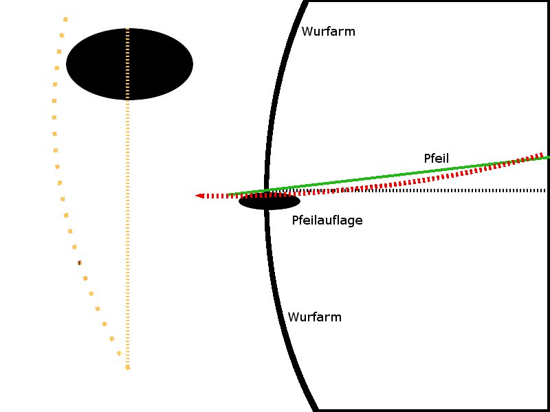 (Kräfteparallelogramm). Die eine Kraft treibt den Pfeil nach vorn in gerader Linie zum Ziel, die andere versetzt ihm eine Drehbewegung . Der Bogen dreht sich in der Hand, unten nach vorn,oben nach hinten, Also Nockpunkt nach unten. Also Pfeilnocke auch nach unten, und Spitze nach oben. Da der Pfeil nicht auf der Sehen rutschen kann, wird der Schwerpunkt des Pfeils nach oben beschleunigt. Der Pfeil hebt ab.