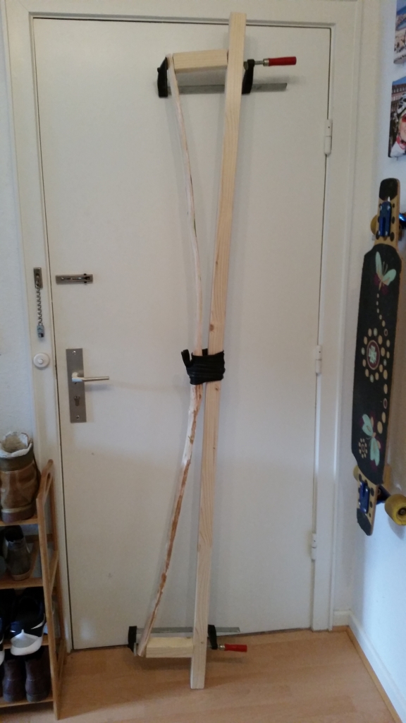 Ab Mittwoch bis ca. Ostern habe ich ein anderes Projekt auf der Liste, und solange könnten beide Stäbe in Ruhe trocknen. Noch ist der Rohling auch zwei Meter lang, und ich dachte darüber nach ihn auf 1.70m zu kürzen, um auf etwa 1.65m NTN zu kommen. Das Zuggewicht spielt bei meinen Bögen erst mal keine Rolle. Hauptsache ist, ich schaffe es einen Rohling in einen Bogen zu verwandeln