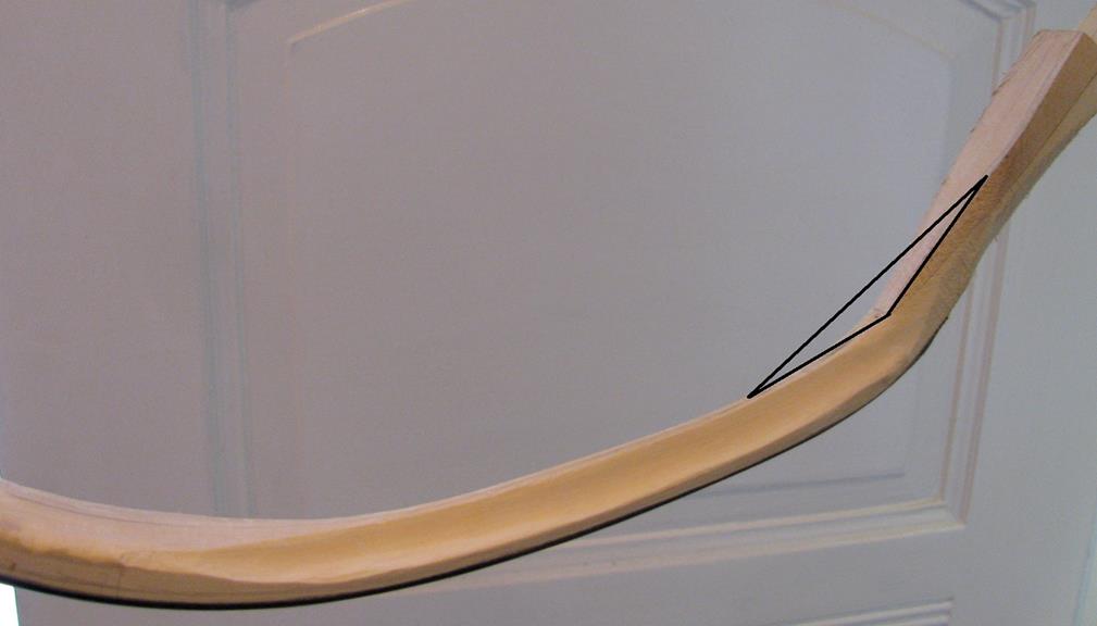 und zwar bin ich mir gerade sehr unsicher, ob ich am Übergang Kasan/Tip genug Holz habe. Ich fürchte der Bereich ist etwas zu dünn. Ich habe es auf dem Bild mal eingezeichnet. 12mm Holz hab ich an der Stelle an Dicke. Ein bisschen Sehne könnte noch draufkommen; die Breite verringert sich von 20 auf 16mm. Aber wenn ich meine Literatur richtig interpretiere, sollten da eher so 16mm dickes Holz sein??