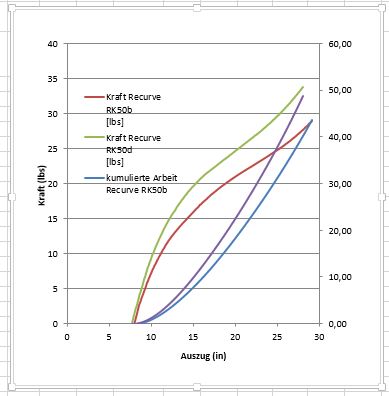 An dem Auszugsdiagramm seht Ihr zwei Kraft-Weg Kurven. Die untere ist von dem ursprünglichen Griff mit den größeren Winkeln, die obere mit dem neuen Griff. Natürlich ist durch die höhere Vorspannung auch das Zuggewicht etwas gestiegen.