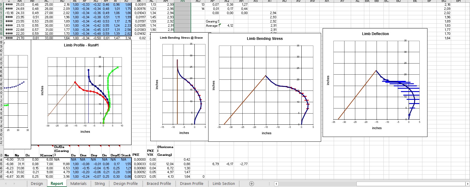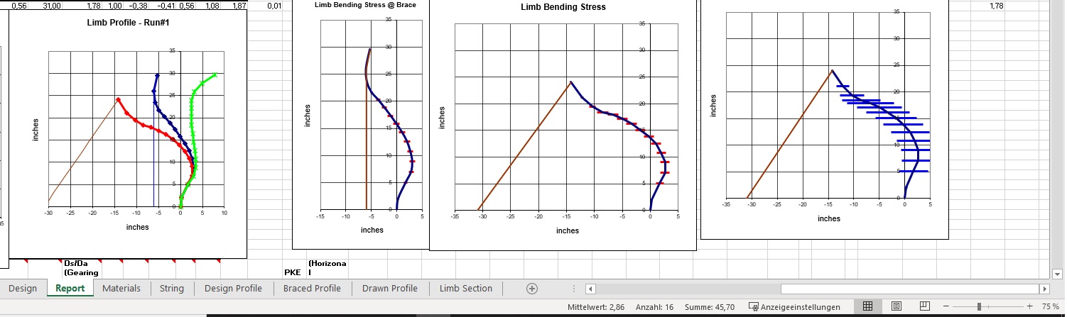 Die imho wichtigsten Graphiken sind die beiden "limb bending stress", da würde ich zusehen, den Streß möglichst gleichmäßig zu verteilen.