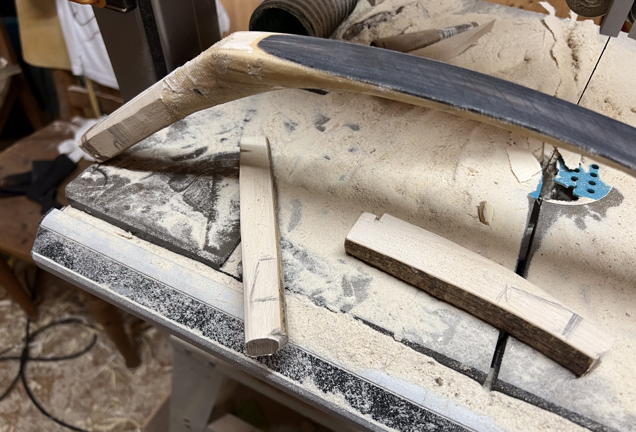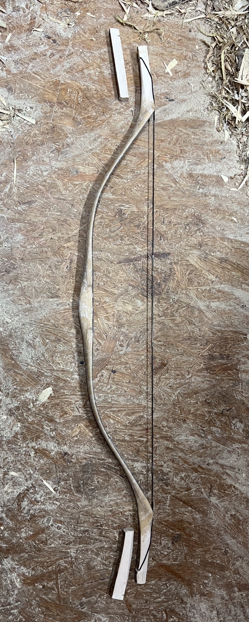 Haselreste Komposit: Heute Nachmittag habe ich begonnen übers Knie zu tillern, viel zu stark, Abschleifen des Horns an den Rändern auf 2mm, Biegen übers Knie bis auf Standhöhe und dazwischen immer wieder Horn abschleifen. Dann Anbringen der Nockkerben, sicherheitshalber 2,5cm länger, Sicherheitswicklung unterhalb der Nocken und dann das erste Mal Aufspannen (Durchsteigmethode, bei diesem Bogen verwende ich kein Tillerbrett), schaut nicht so schlecht aus, die Tips sind etwas verzogen, aber ausreichend breit für die Korrektur, dann Kürzen der Tips, Verschmälern mit Richtungskorrektur, wieder Aufspannen und Pumpen bis 20 Zoll, mehrmals das Knacksen, man kennt es ja, aber es ist trotzdem jedesmal unangenehm und spannend, aber nichts passiert, Schlaufe drauf zum Erziehen, jetzt soll er ein paar Stunden aufgespannt bleiben, bis jetzt Glück gehabt