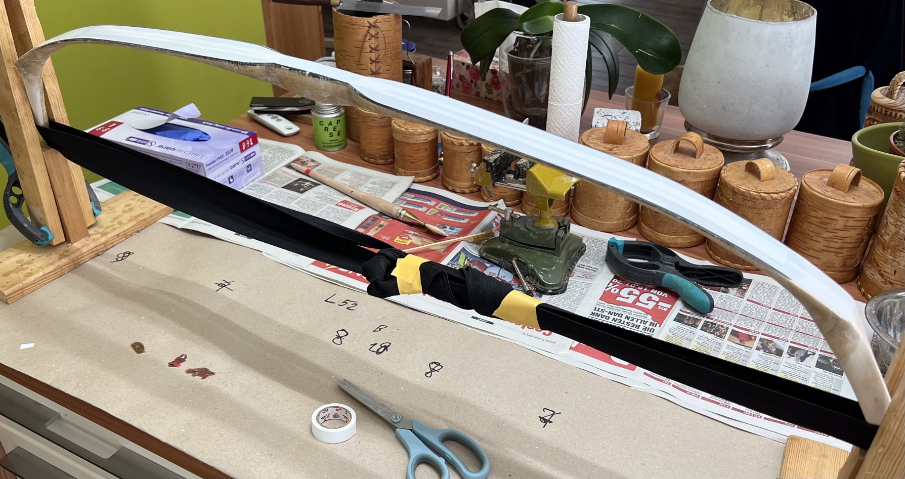 Holler Paddelbogen: im Griffbereich habe ich eine Schwachstelle und bei den Biegeversuchen sieht man, dass er dort auch ein bißchen mehr biegt, habe mich entschieden, den Griff mit einer 3. Lage Sehne zu belegen und zusätzlich die Schwachstelle mit einer Wicklung zu versehen. Auch die Wickelnocken habe ich mit je einer Sehnenwicklung verstärkt. Nach dem Gelieren wickeln mit Hosengummi 2x gegengleich und ab in den Timar (äh, Sauna natürlich bei 55 Grad)