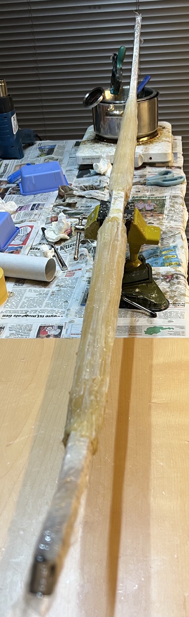 Gestern am Abend habe ich dann die Straußensehnen aufgeklebt. Den Bogen habe ich vorsichtig mit dem Fön erwärmt und dann mit Glutinleim eingestrichen. Ich habe einen Hasenhautleim mit etwas zugesetztem Fischleim verwendet. Die Mischung habe ich in der Früh mit heißem Wasser angesetzt, damit das Granulat schön quillt. Dann im Wasserbad bei 55 Grad unter Zugabe von Wasser verflüssigt. Von der Konsistenz her etwas flüssiger als Honig.