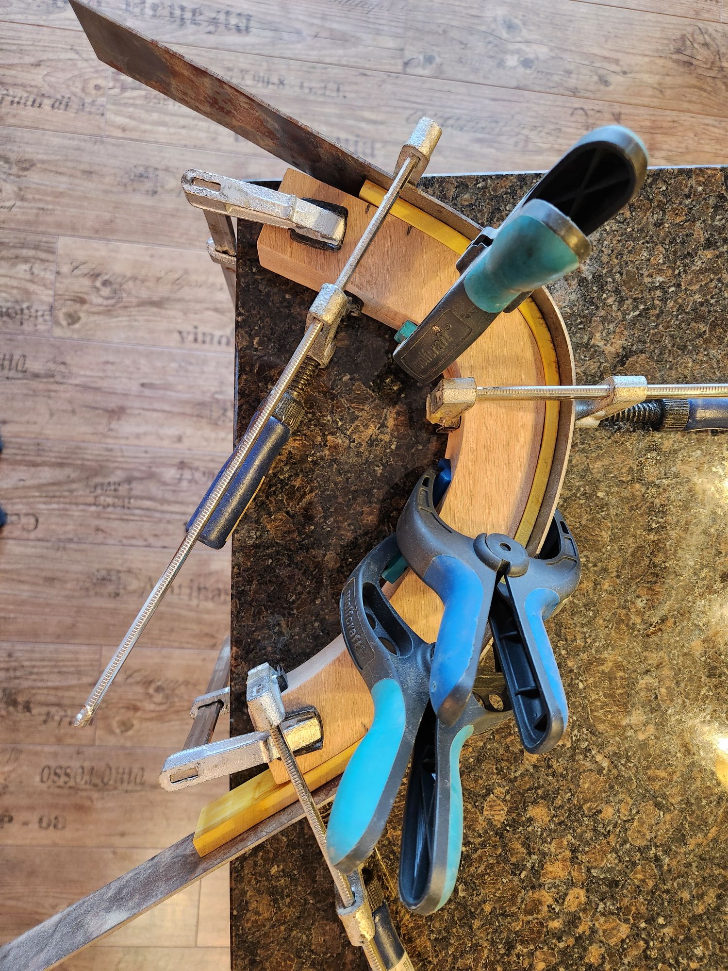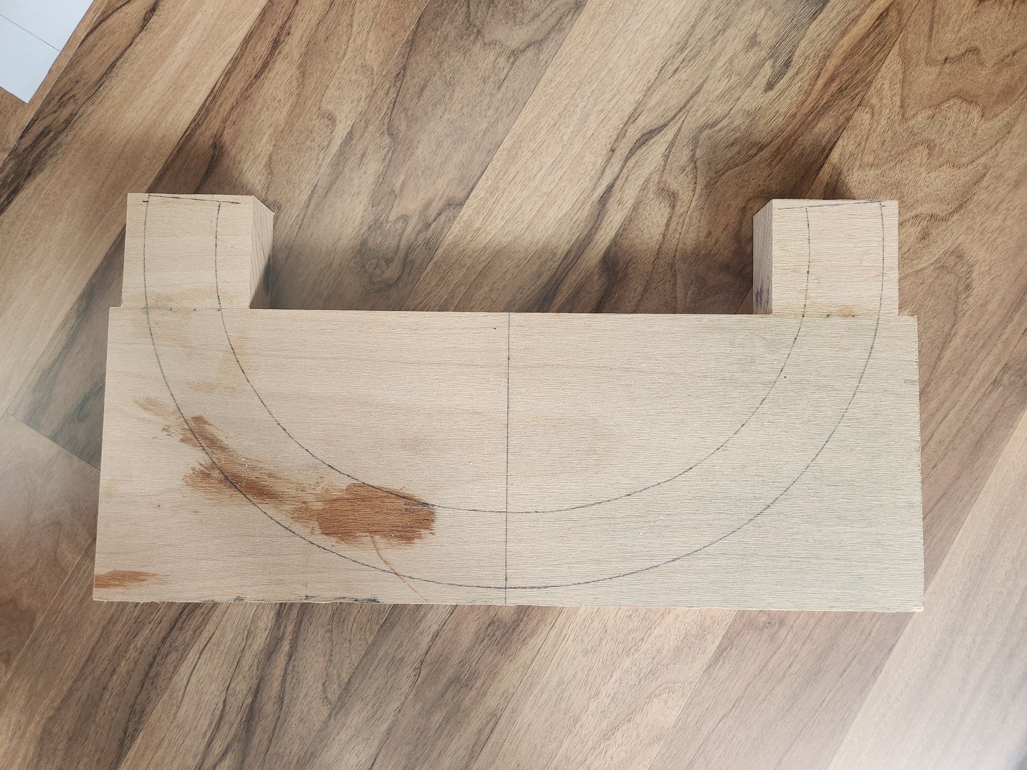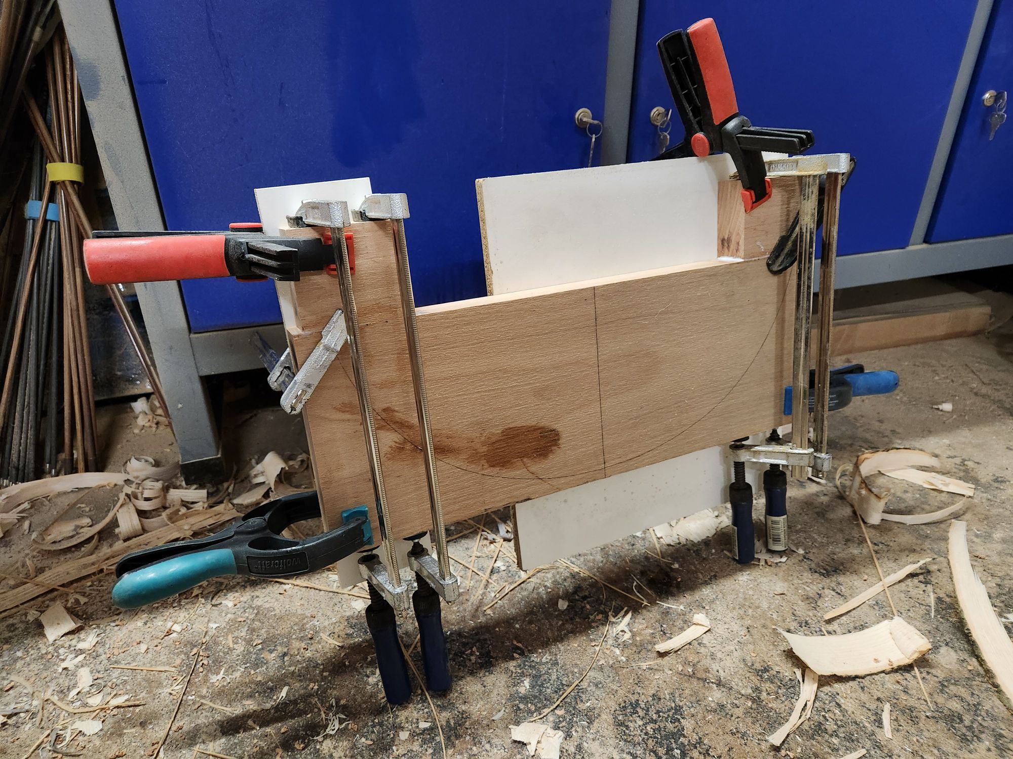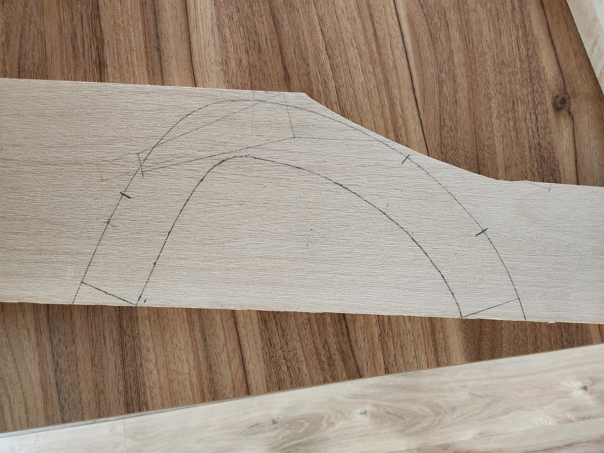 Die erste Form für Bogen Nr.2 hab ich schon mal vorbereitet. Meine Buchenbretter sind zu schmal für die Laminierform. Deshalb hab ich 2 Klötze angedübelt. Und die Form für die neuen Siyahs ist auch schon aufgezeichnet. Hier wechsel ich wieder die Methode auf das trocknen lassen in der Form da die zuletzt gebogenen Teile mit dem verzahnten Stock leider verdreht rausgekommen sind. Und ich werde diesmal einen Blechstreifen beim biegen beilegen, da die Form schon recht heftig ist.