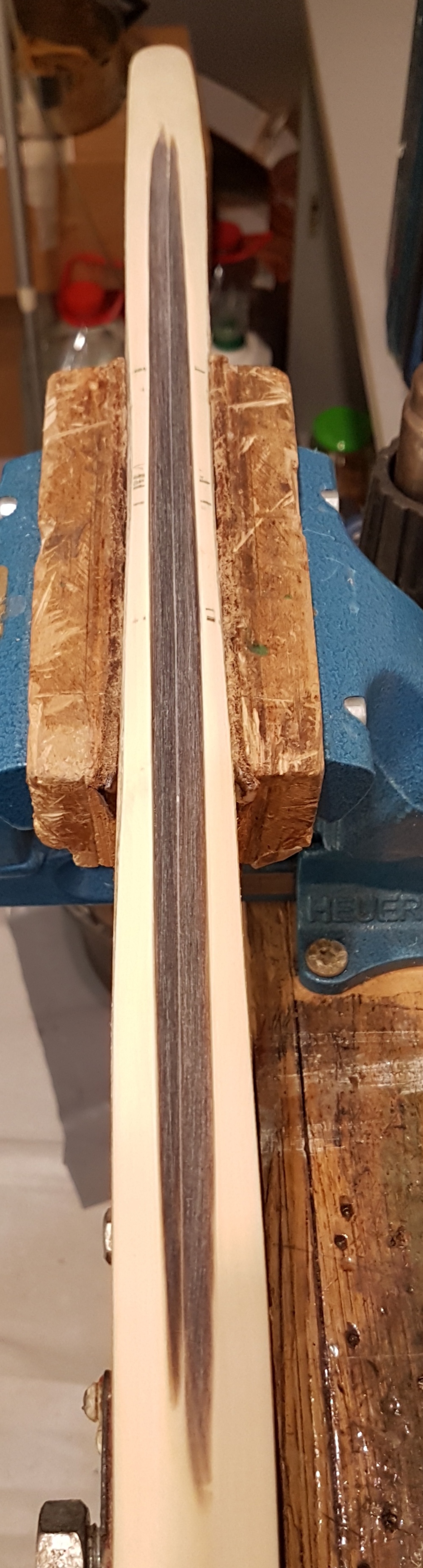 Wie dem auch sei - ich habe die Mitte zurecht gebogen und wieder einmal ein Experiment gestartet. Ich habe einige Horn-Seitenteile rumliegen und einige Streifen geschnitten, getestet ob die Dinger die erforderliche Biegung mitmachen und etliche in die Tonne geschickt. Aber zwei Teile finde ich OK, also habe ich die Dinger etwas begradigt, zueinander passend geschliffen und gegenläufig auf den Bauch geklebt. Die Streifen sind zusammen max. 12 mm breit und max 5 mm dick. Die Länge ist 50 cm. Mal sehn ob der Kleber das mitmacht. Eigentlich wollte ich bei diesem Bogen kein Epoxid einsetzen, Glutinleim war mit aber zu aufwendig.