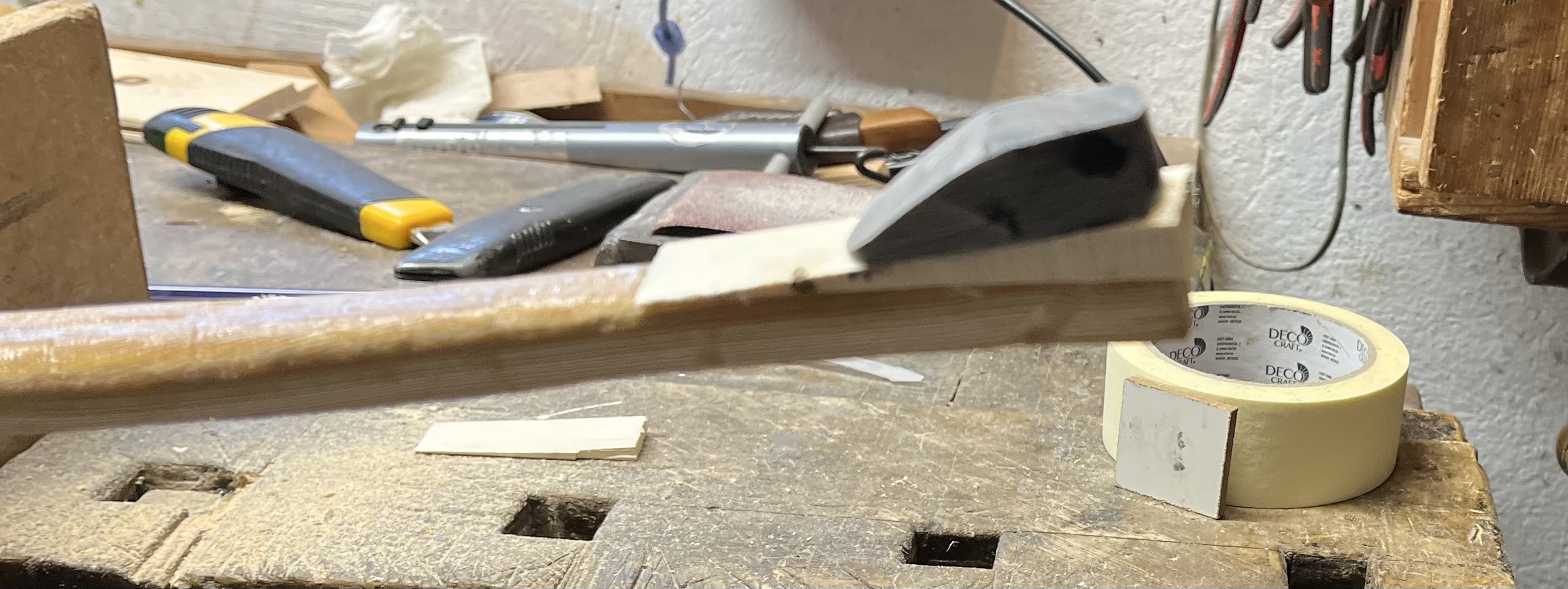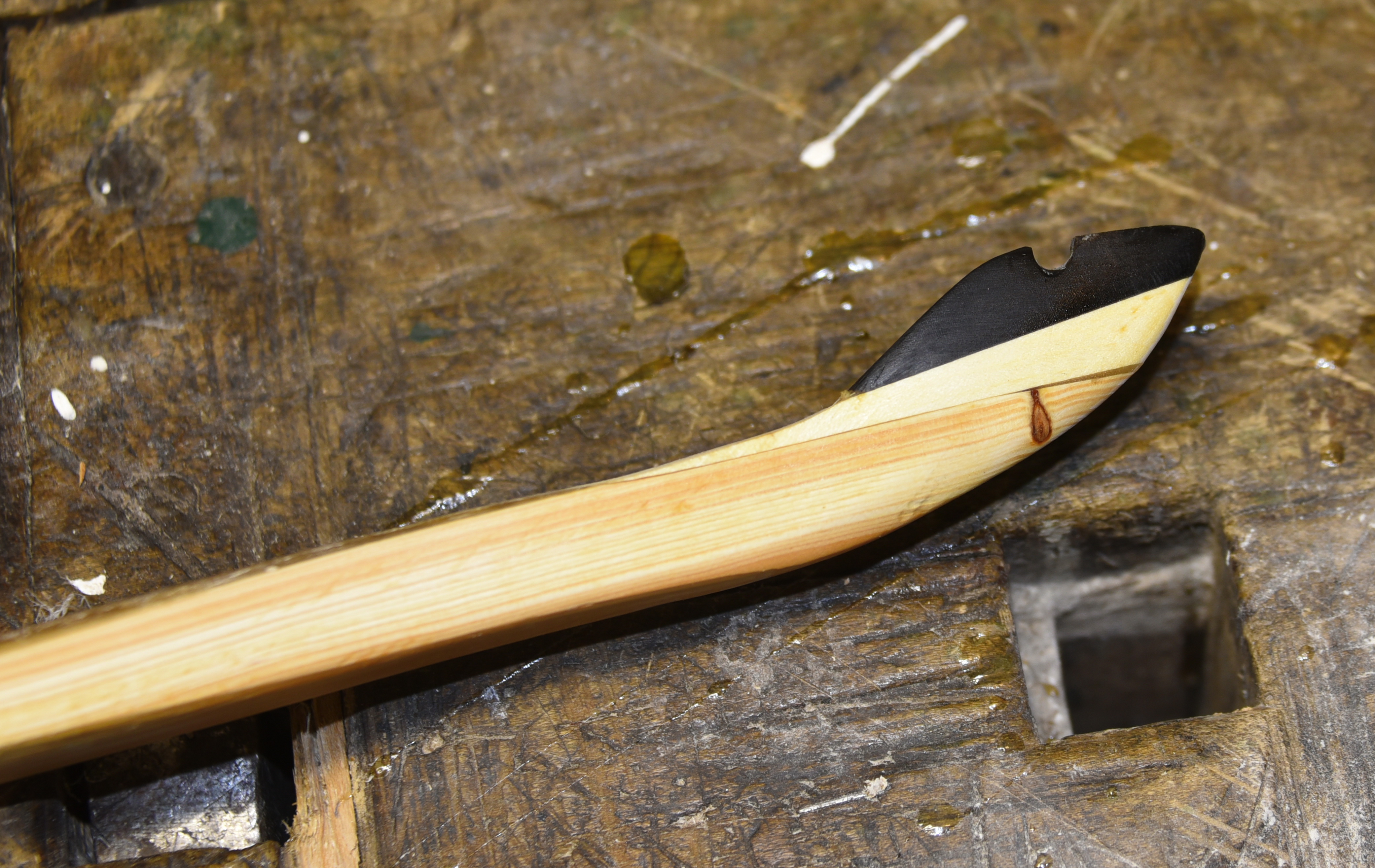 Auf einer Seite habe ich mit dem Bandschleifer etwas Zuviel abgeschliffen vom Sehnenbacking, habe deshalb einen längeren Keil aus Hainbuche unter das Overlay geklebt. Die Overlays wurden mit Uhu Endfest 300 geklebt.