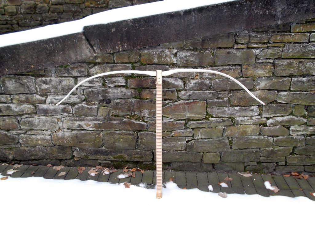 Gestern hab ich den Bogen dann mal voll ausgezogen und mit Wassereimern das Zuggewicht bestimmt - 32#@28" - Norm erfüllt und keine weiteren Stauchbrüche