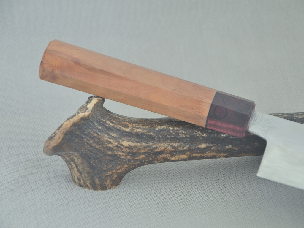 Eine kleine Anmerkung hätte ich. Nach unten gebogene Griffe finde ich unergonomisch. Das wirkt entgegen der normalen Handhaltung beim schneiden. Ich gebe aber zu dass ich das bei meinen ersten Küchenmessern auch so gemacht habe.