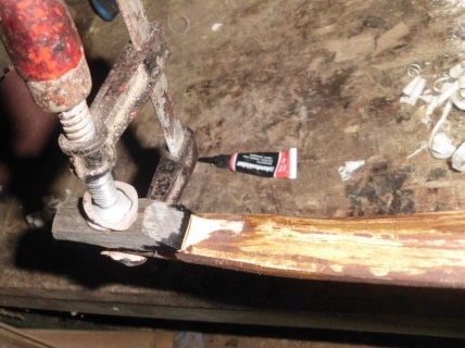 Mit Sek Kleber Marke "Chinastinkig -> kräftig schnell und gut" aufgeklebt . Anschließend wurden der vorgebeizte Bogen und die overlays geschliffen um die Endgültige Form im Nockenbereich des Bogens zu erhalten.