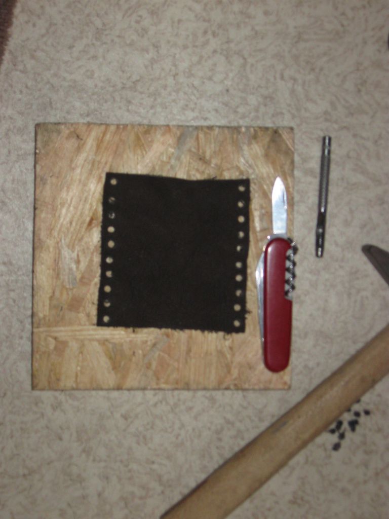 Wie ich´s hier im Forum gelesen habe zeige ich´s hier mal mit Bildern. Da mein Griffstück schön gleichmäßig ist, brauchte ich nur ein einfaches, rechteckiges Leder zuzuschneiden. Dann habe ich 4mm Löcher reingestanzt Das nächste Mal werde ich sie kleiner stanzen, da mein Lederband auch 4mm breit ist und ich sicher gehen wollte, daß da nix knubbelt, aber das seht ihr später.