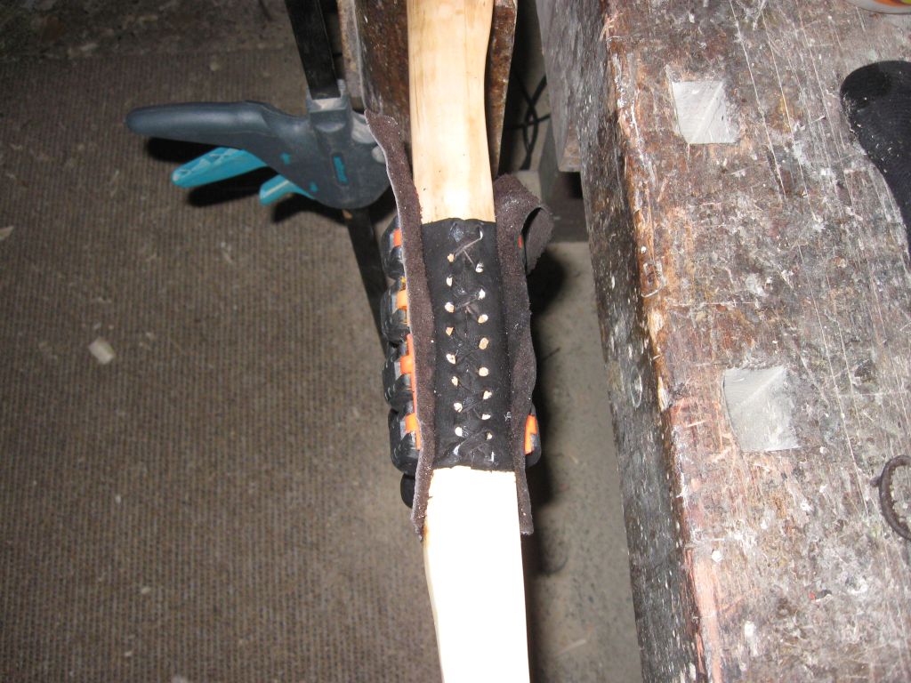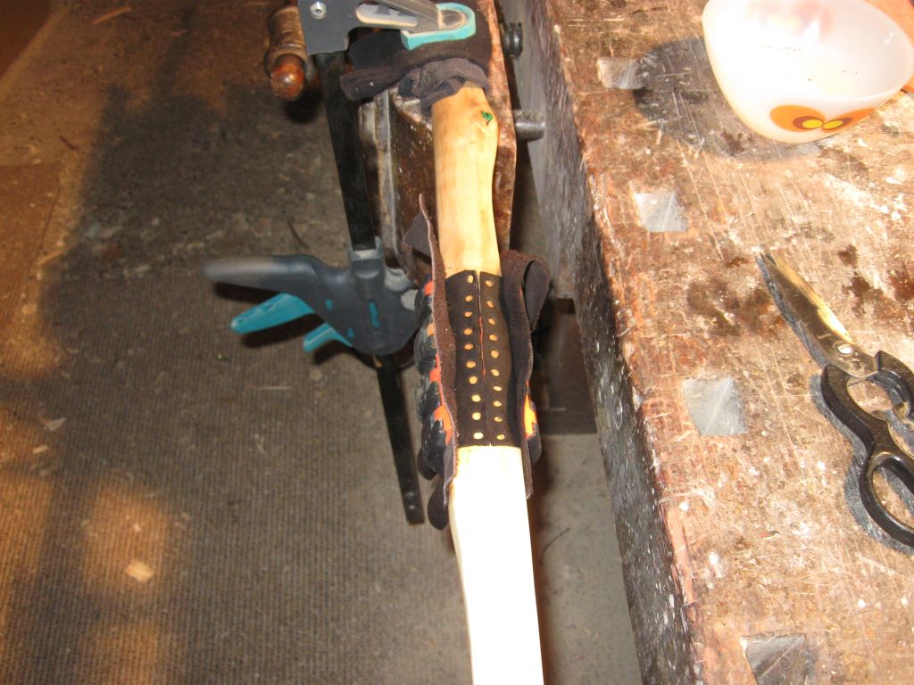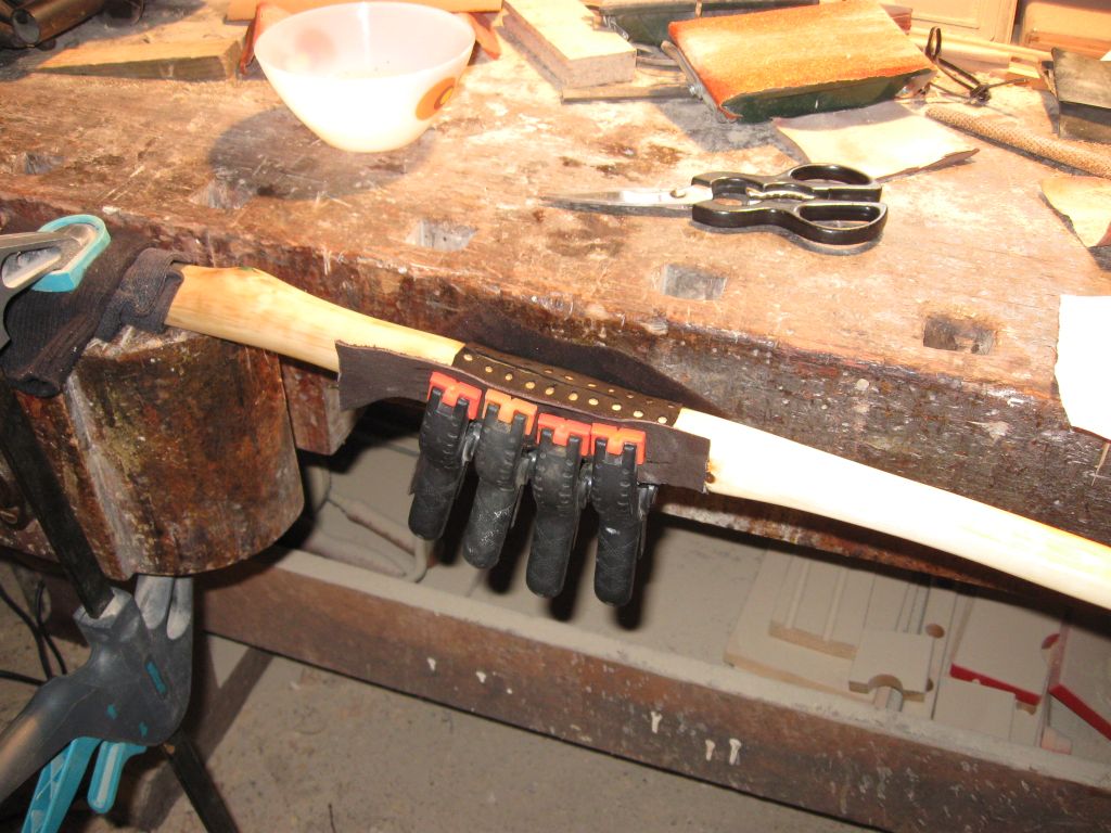 Das Lederstück habe ich 15min ins Wasser gelegt ausgewrungen und und dann zur Hälfte mit Leim eingeschmiert dann direkt auf den Bogen und schöön laang aufgepresst ein Stück Leder je rechts und links, damit sich die Leimzwingen nicht in meinem Griffleder abdrücken dann die Oberseite geleimt und mit Band geflochten und Stück für Stück festgedrückt.